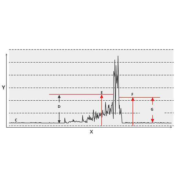 Sobald der Molch den Detektor mit Schwinggabel passiert hat, fällt der Geräuschpegel wieder auf das normale Level. Wenn der Pegel einen definierten Grenzwert (F) unterschreitet, wird die Meldung „Molchpassage“ ausgelöst und während der Molch sich weiter durch das Rohr bewegt, sinkt das Geräusch des Molchs wieder unter den Passage-Schwellenwert (G).