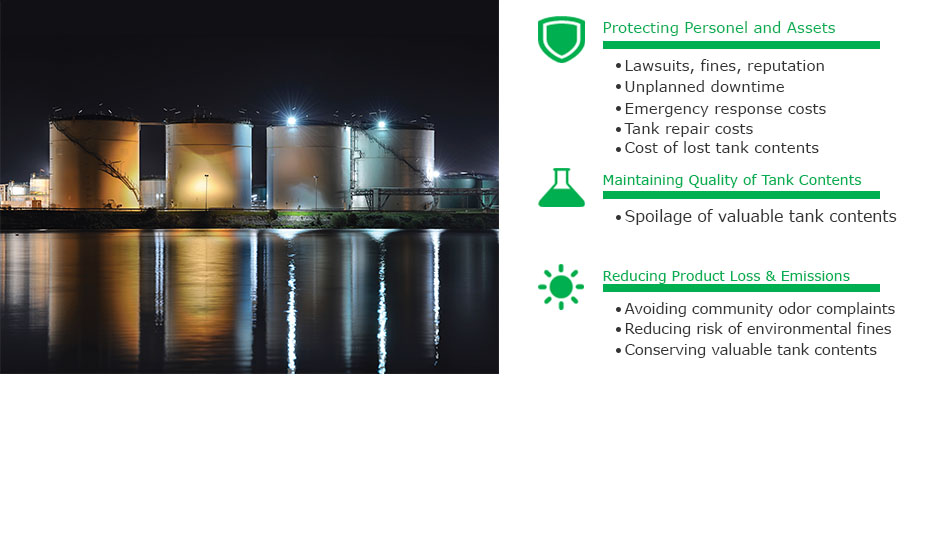Dem Schutz Ihrer Mitarbeiter und Ihrer Anlage gebührt höchste Priorität. Der Tankinhalt ist wertvoll und muss vor Oxidation und Produktverlusten geschützt werden. Darüber hinaus gewinnt die Kontrolle von Emissionen zunehmend an Bedeutung, da Regierungsbehörden weltweit die positiven Aspekte des Umweltschutzes im Fokus haben.