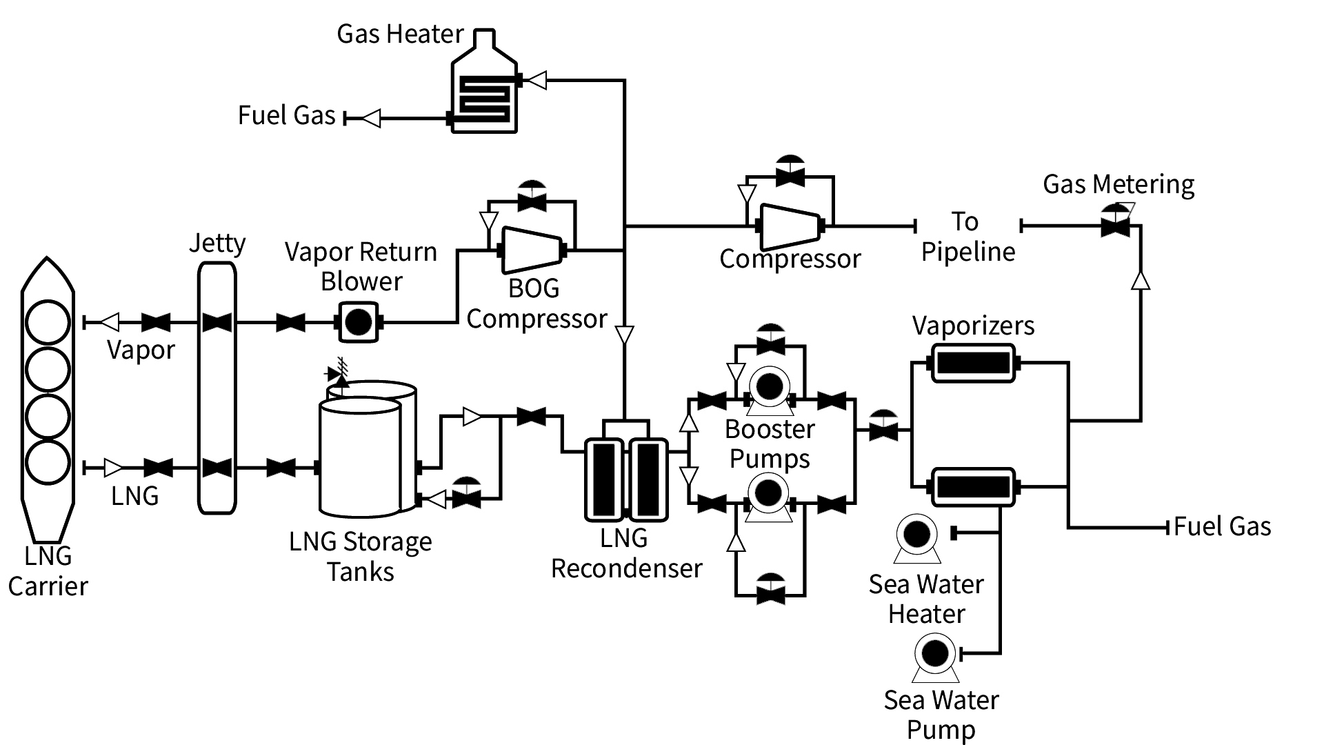 Normalerweise werden zwei oder mehr oberirdische Tanks benutzt, um LNG zu speichern. Das durch Wärmeübertragung in den Tanks und LNG-Leitungen entstehenden Siede-Verluste ( Boil-off-Gas BOG) werden komprimiert und in einem Rekondensator verflüssigt, um ein Abfackeln oder Entlüften zu vermeiden und die Umweltbelastung zu minimieren.