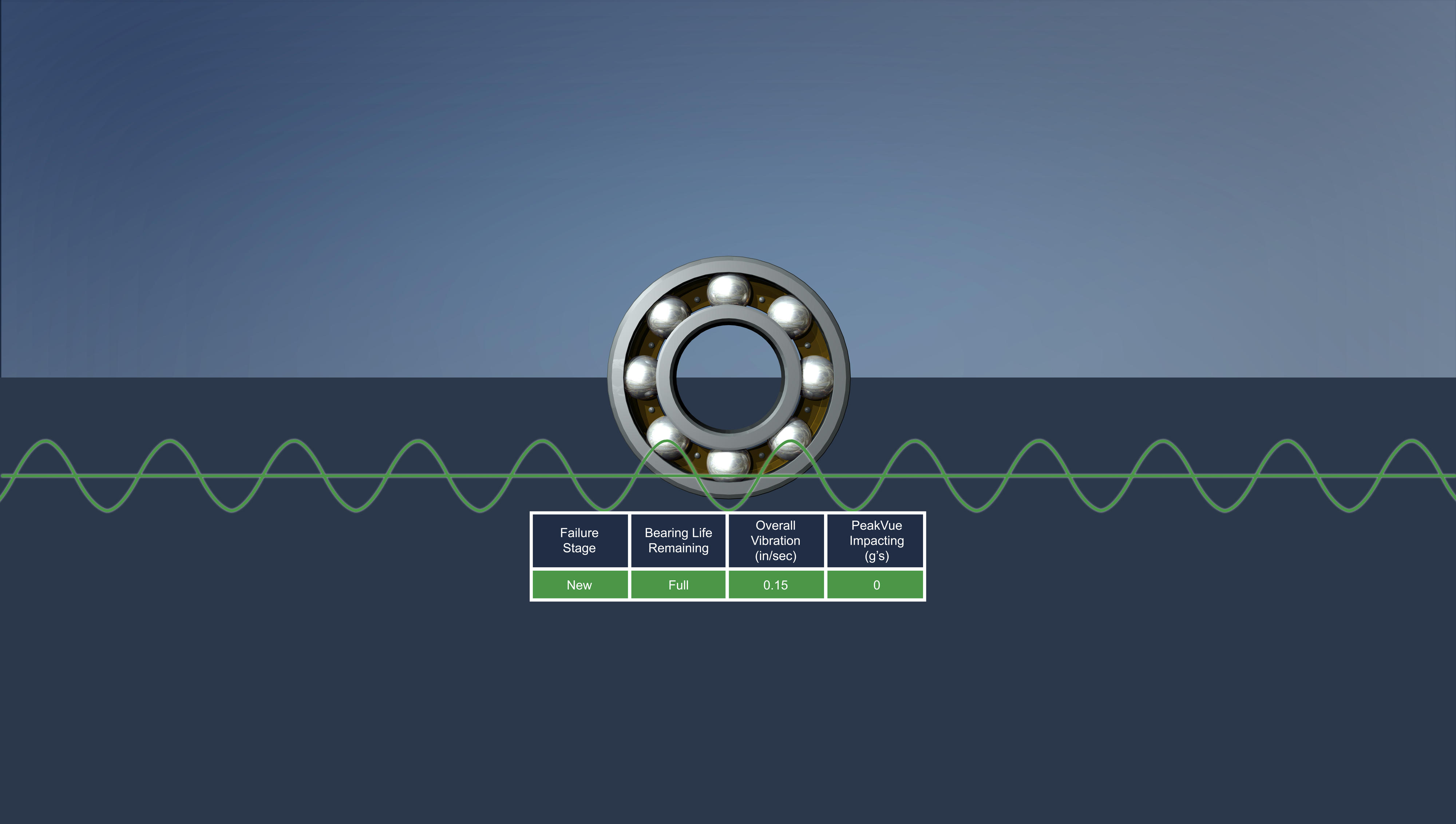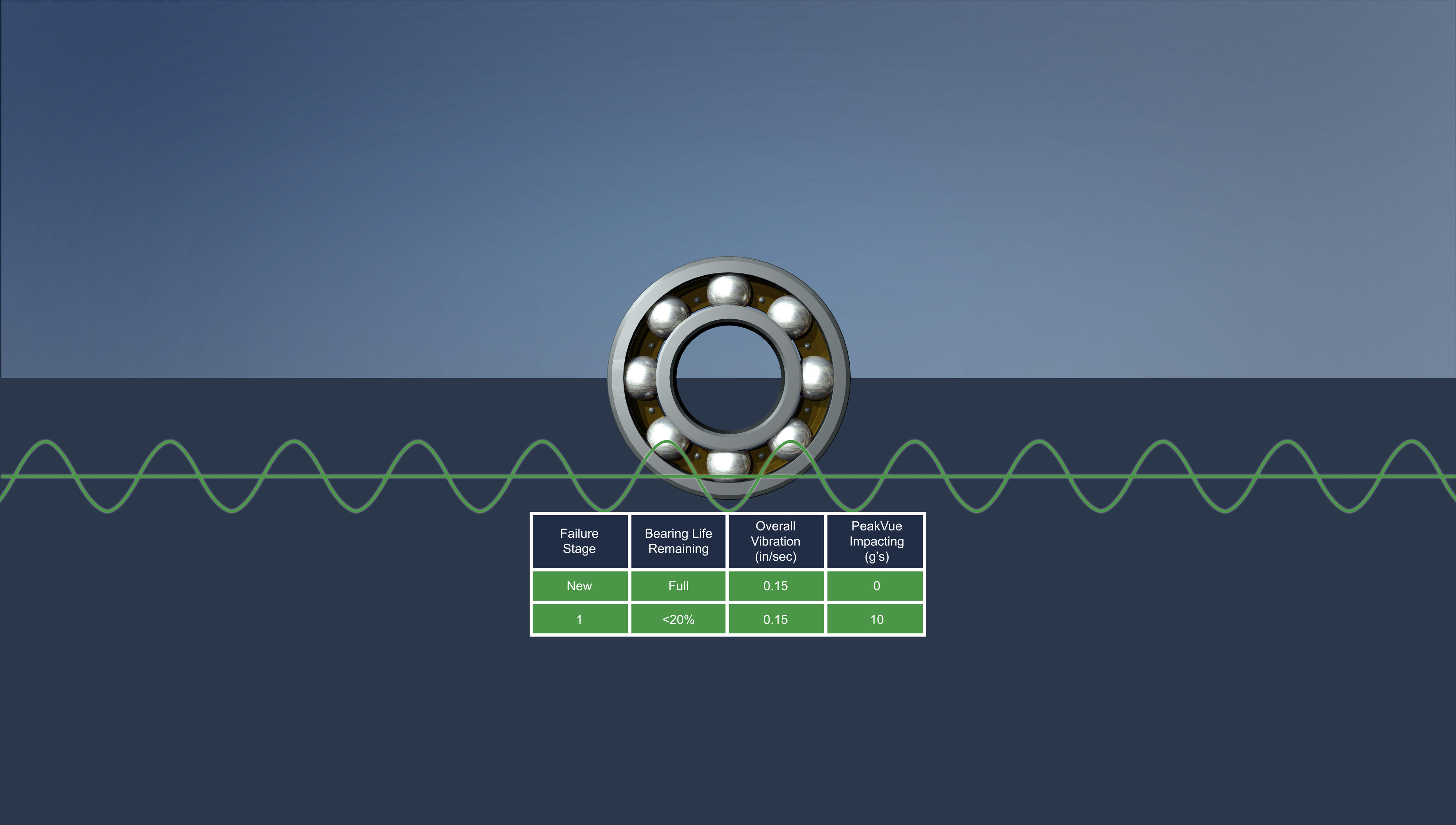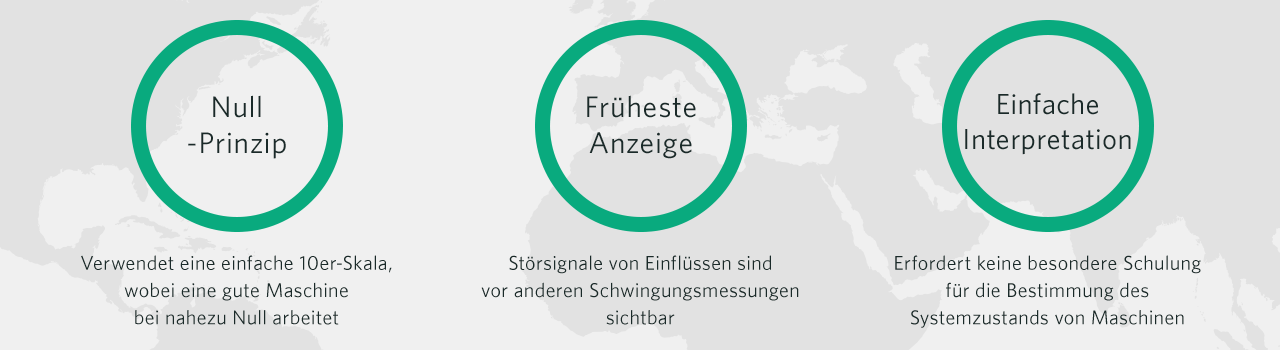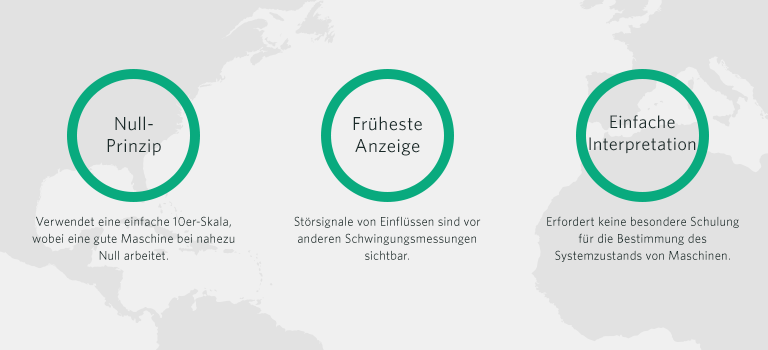 Der eintretende Ausfall kündigt sich mit einer deutlichen Verstärkung der allgemeinen Schwingung an; für eine Planung ist es dann zu spät. Die Benachrichtigung über die Abschaltung der Maschine liegt dann praktisch vor. Hingegen zeigt PeakVue einen sich entwickelnden Fehler bereits Wochen oder Monate zuvor an. Unmittelbar vor einem Ausfall können die PeakVue Werte schnell auf 50 g oder höher springen.