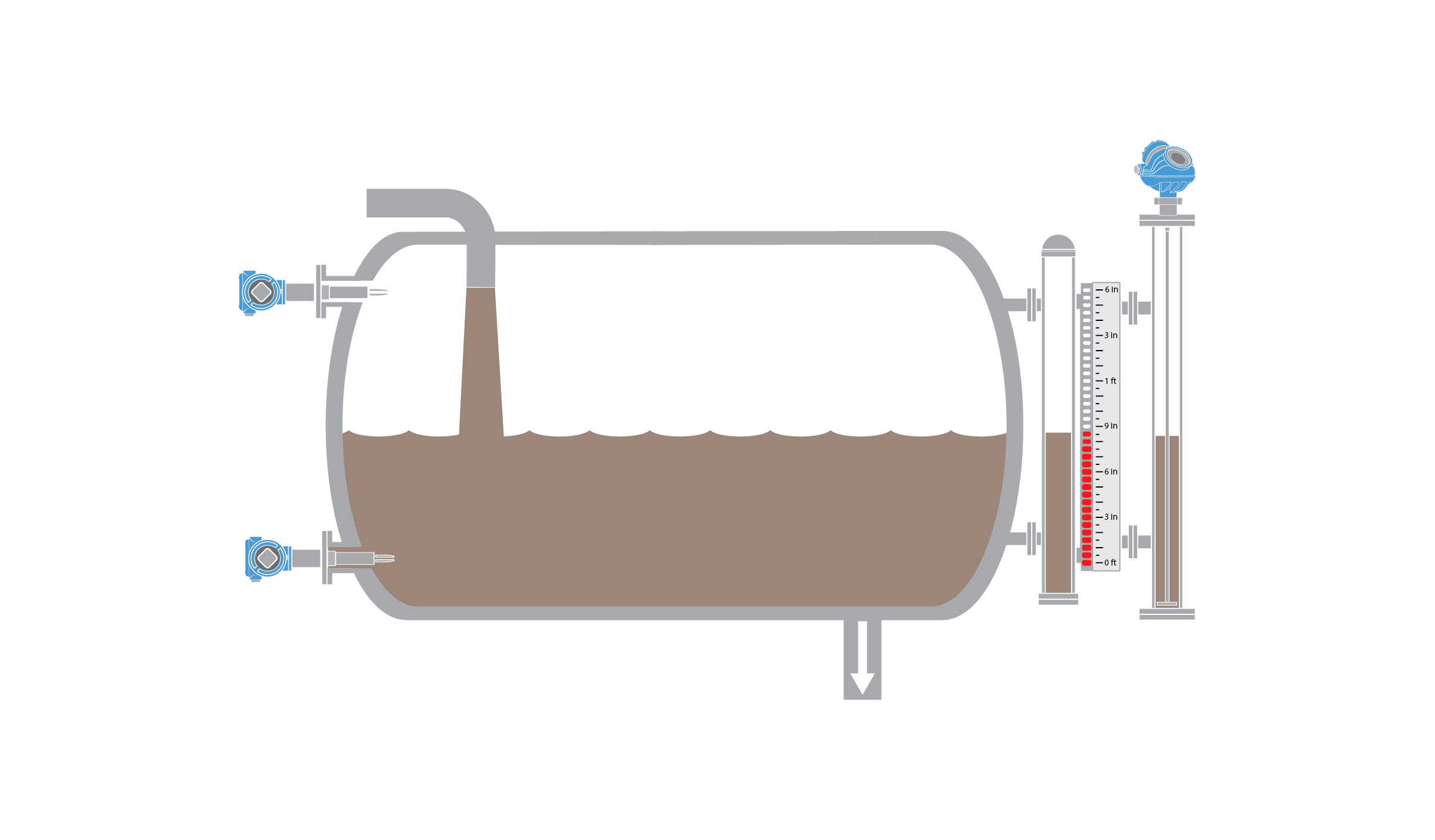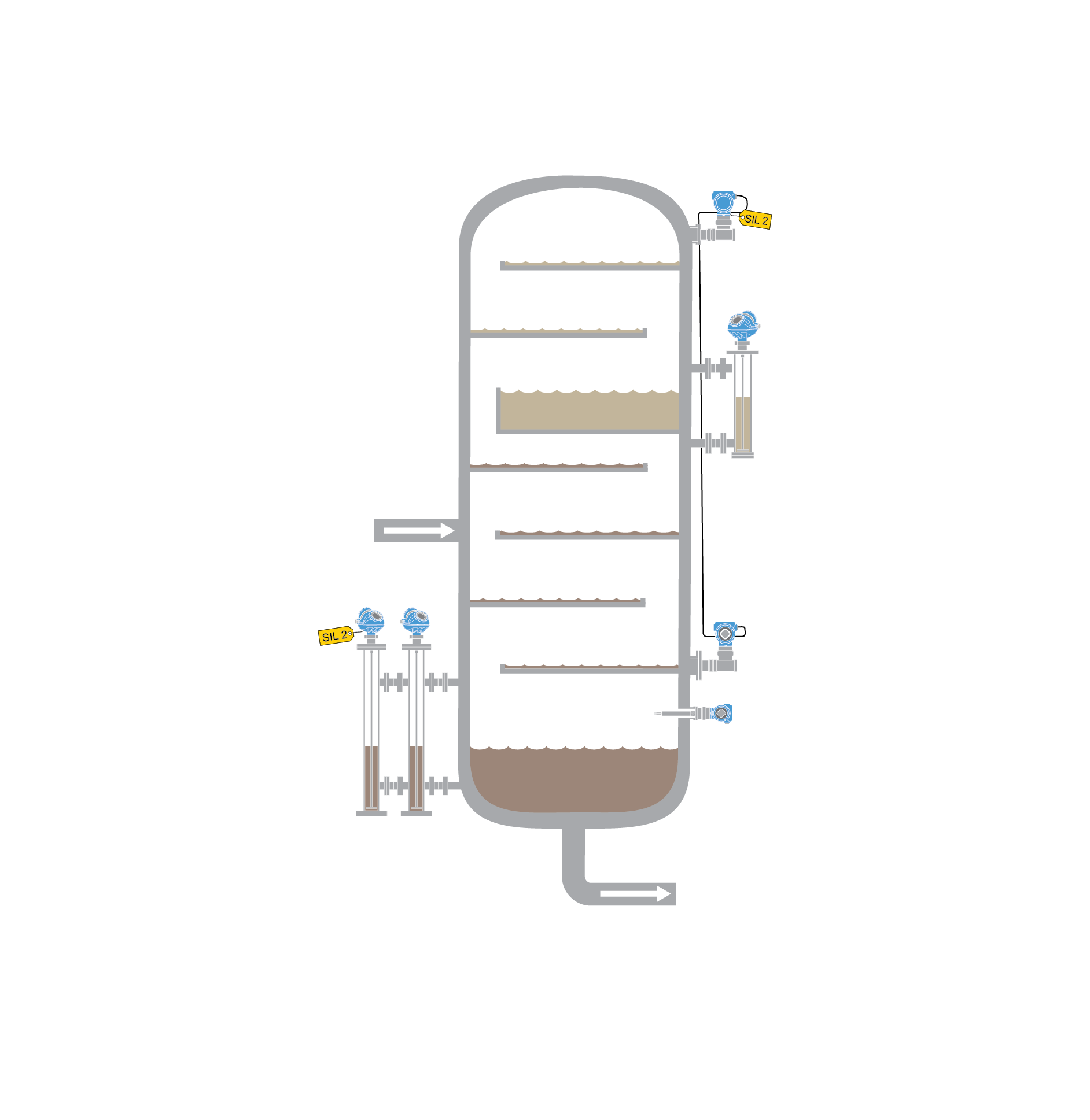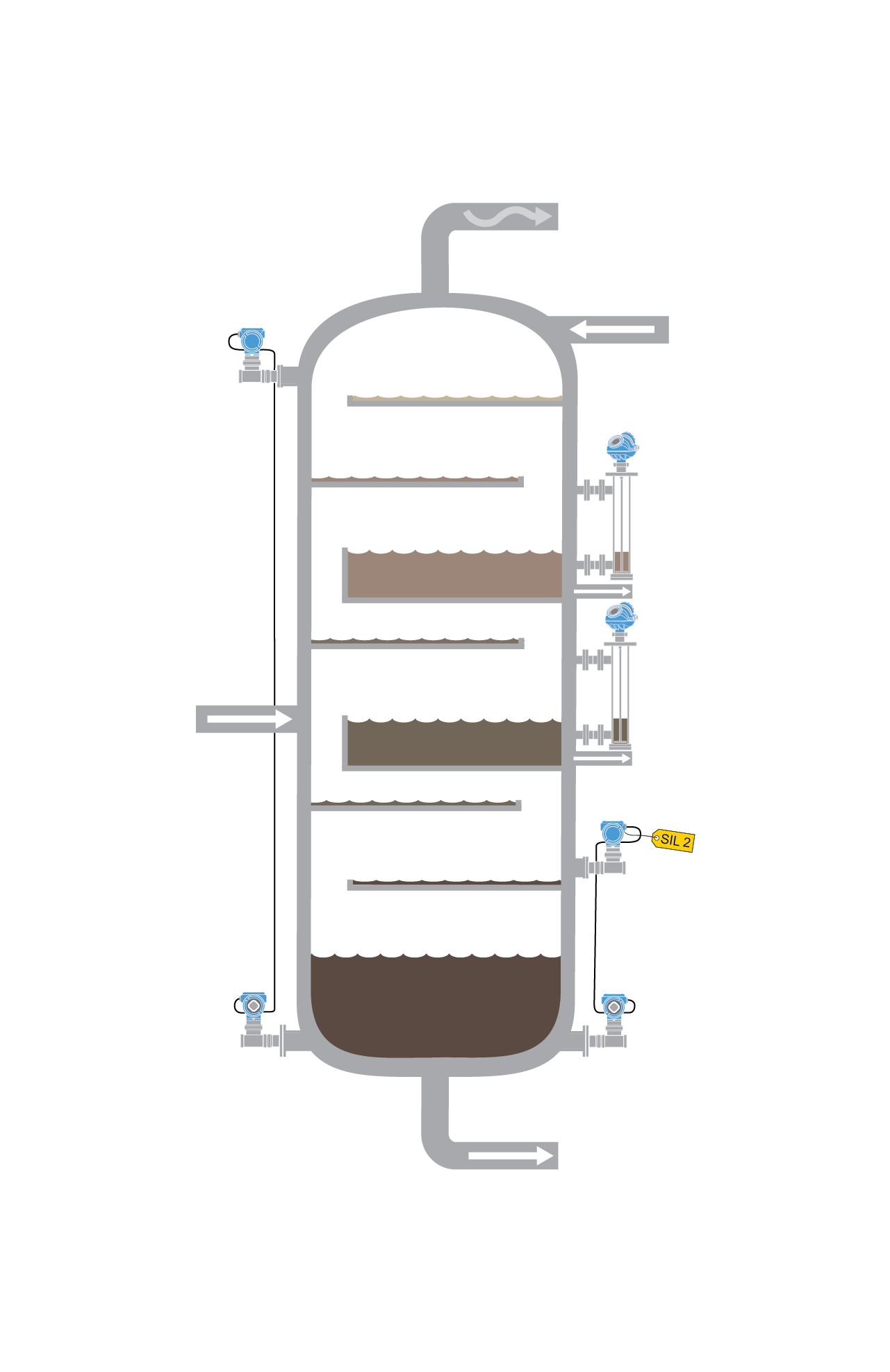 Destillationskolonnen ermöglichen die Trennung von Flüssigkeitsgemischen basierend auf deren Siedepunkten. Wenn die Dämpfe durch die Kolonne aufsteigen, kondensieren verschiedene Komponenten bei unterschiedlichen Temperaturen und werden gesammelt, um die Entnahme zu ermöglichen. Destillationskolonnen weisen über ihre gesamte Höhe hinweg einen großen Temperaturbereich auf. Insbesondere am unteren Ende können Medien verschmutzt sein und die Ausrüstung beschichten und verstopfen. Das Risiko einer Überfüllung besteht vor allem beim Anlauf der Anlage und bevor ein Gleichgewicht zwischen Flüssigkeits- und Gasdurchfluss erreicht wird. Bei einer Überfüllung gelangen die Prozessmedien gewöhnlich in das Abfackelsystem für Kohlenwasserstoffe, wodurch das Risiko eines gefährlichen Vorfalls bzw. einer Explosion besteht.