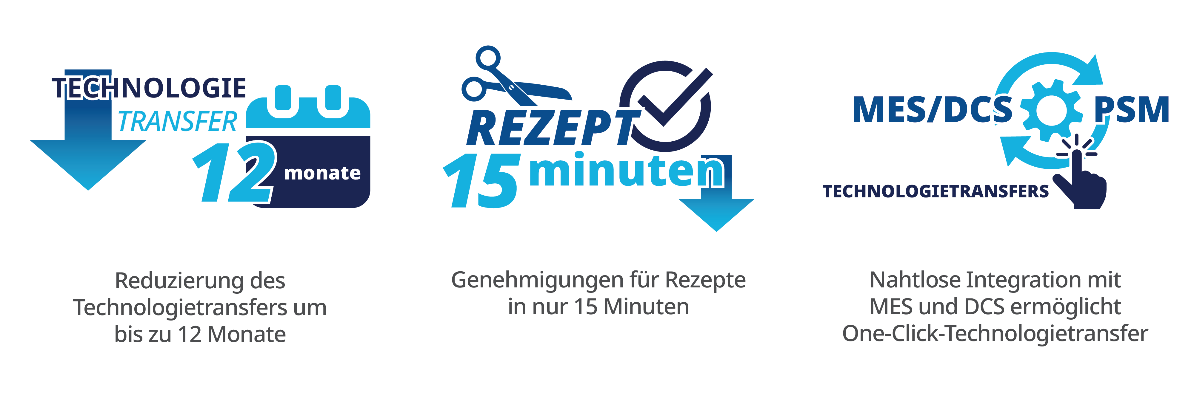 DeltaV PSM standardisiert die Produktdefinition, Spezifikationsstrukturen und Prozessterminologie während der Forschungs- und klinischen Phase, bevor die Rezeptur an Ausführungssysteme wie z. B. ein Manufacturing Execution System (MES) oder dezentrales Leitsystem (DCS) gesendet wird. Eine konfigurierbare Bausteinbibliothek erlaubt es PD/MSAT-Wissenschaftlern, auf einfache Weise Prozesse digital aufzubauen und zu skalieren. Durch die Digitalisierung von Prozessspezifikationen (Schritte, Aktionen, Ausrüstung, Materialien usw.), die zur Zeit in mehreren Word-Dokumenten, Excel-Tabellen und anderen Formaten gespeichert sein können, entfällt die mühsame manuelle und fehleranfällige Verwaltung der Daten aus diesen unterschiedlichen Quellen.