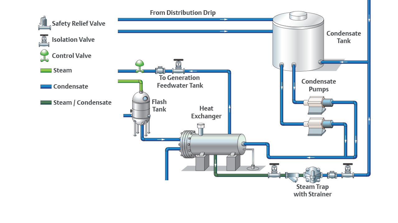 Kondensat- und Wärmerückgewinnung verbessern die Effizienz eines Dampfsystems. Wenn die Anlage mit einem System für Kondensatrückgewinnung ausgestattet ist, wird das Kondensat in einem Behälter gesammelt und dann zur Wiederverwendung in den Kessel geleitet. In ähnlicher Weise gewinnen Entspanner Dampfschwaden aus Kondensatleitungen zurück, die für Niederdruckdampfgeräte verwendet werden können.