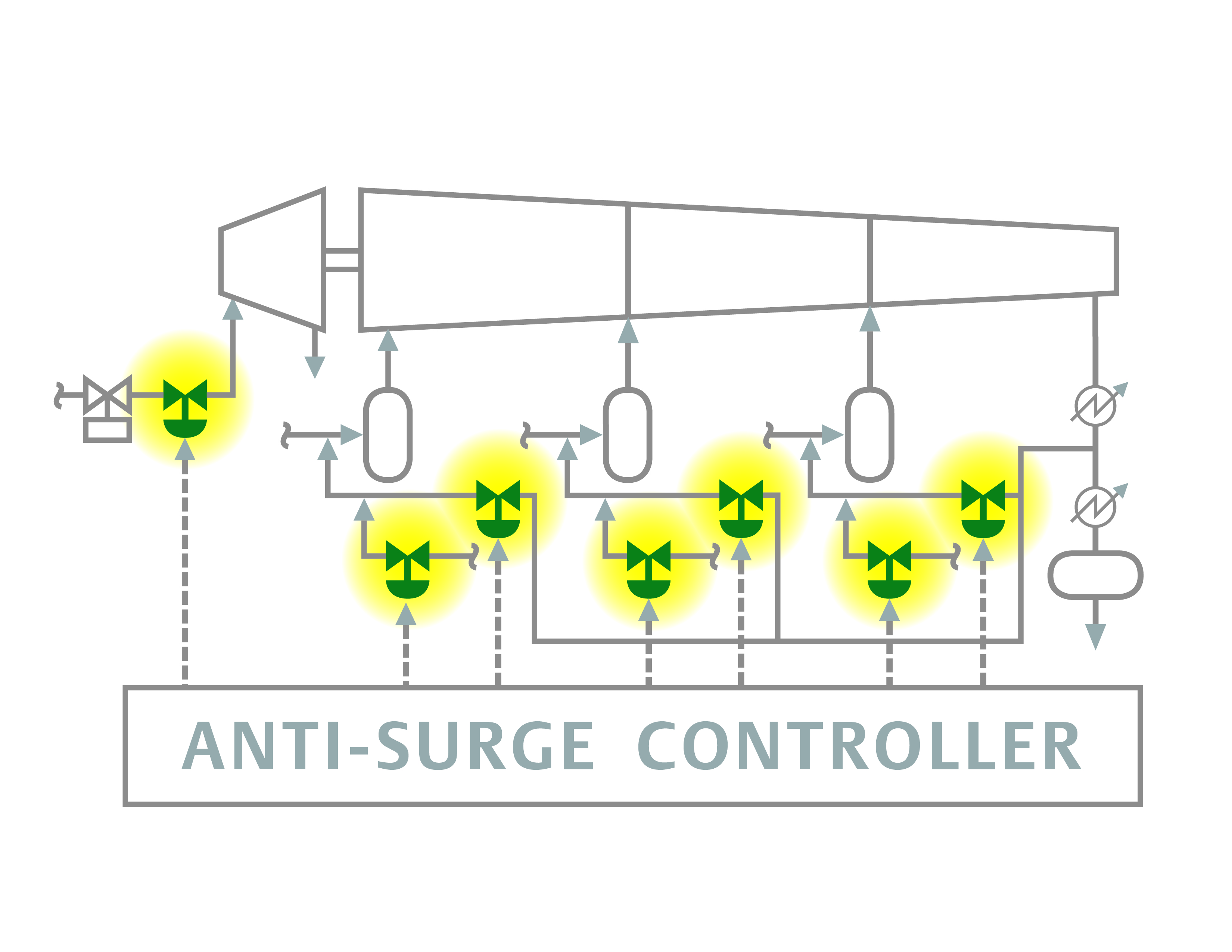 Diese Ventile erkennen, wenn eine Verdichtungsprozessstufe kurz vor dem Überdruck steht und greifen ein, um die Bewegung des Betriebspunktes zur Überdrucklinie umzukehren. Dadurch wird der Mischkammerdruck verringert und der Durchfluss durch den Verdichter erhöht, was in stabilen Arbeitsbedingungen resultiert. Dies wird normalerweise durch das Öffnen eines Regelventils in einer Rückführungsleitung erreicht, wodurch das Druckgas zum Einlass des Verdichters über einen Saugkühler zurückgeführt wird. Der daraus resultierende Anstieg im Verdichtereinlassvolumendurchfluss bewegt den Betriebspunkt vom Überdruck weg.