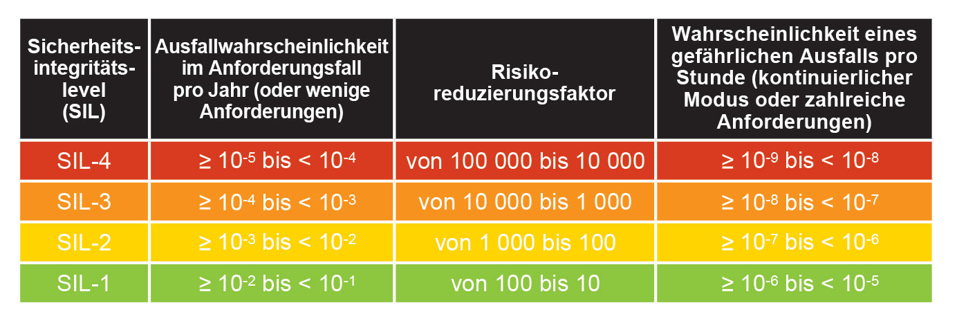 Der Risikominderungsfaktor (RRF) ist der Kehrwert der geforderten Ausfallwahrscheinlichkeit. Beispielsweise entspricht ein erforderlicher Ausfallwahrscheinlichkeitswert von 0,001 einer RRF von 1000, was einen gefährlichen Ausfall alle 1000 Jahre bedeutet.