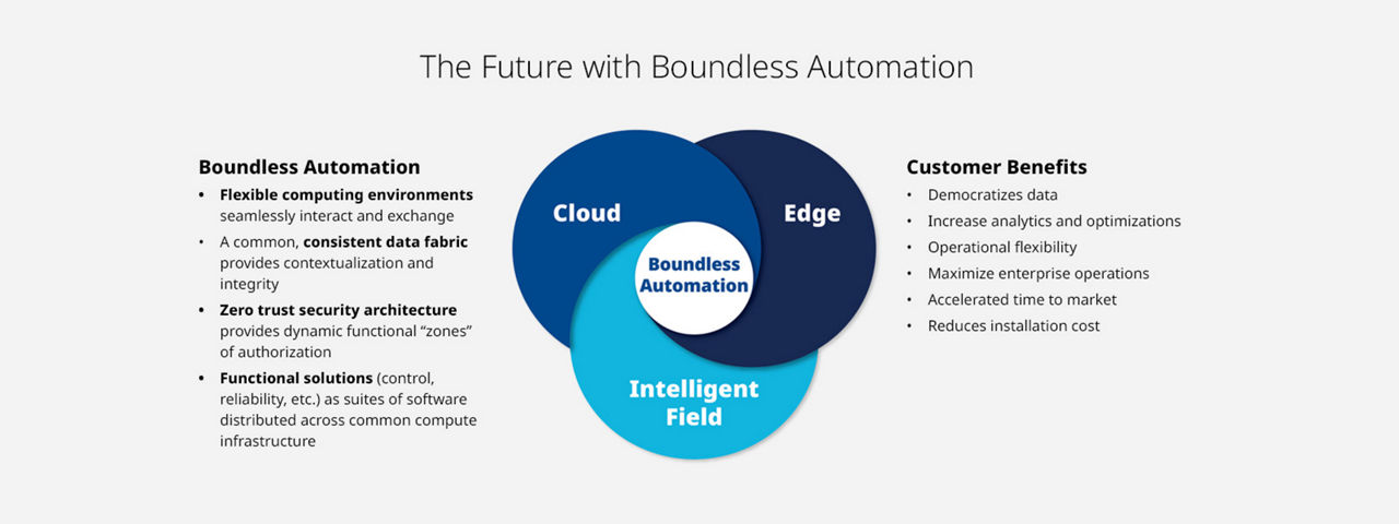 Boundless Automation führt uns mit einer Strategie in die Zukunft, die sich auf drei Schwerpunkte stützt: intelligentes Feld, Edge Computing und die Cloud, die zu einer sicheren, flexiblen Software-Plattform kombiniert werden. Diese nahtlose Datenautobahn ermöglicht die direkte Ausführung von Softwareanwendungen in intelligenten Feldgeräten, erweitertem Edge Computing und der Cloud.