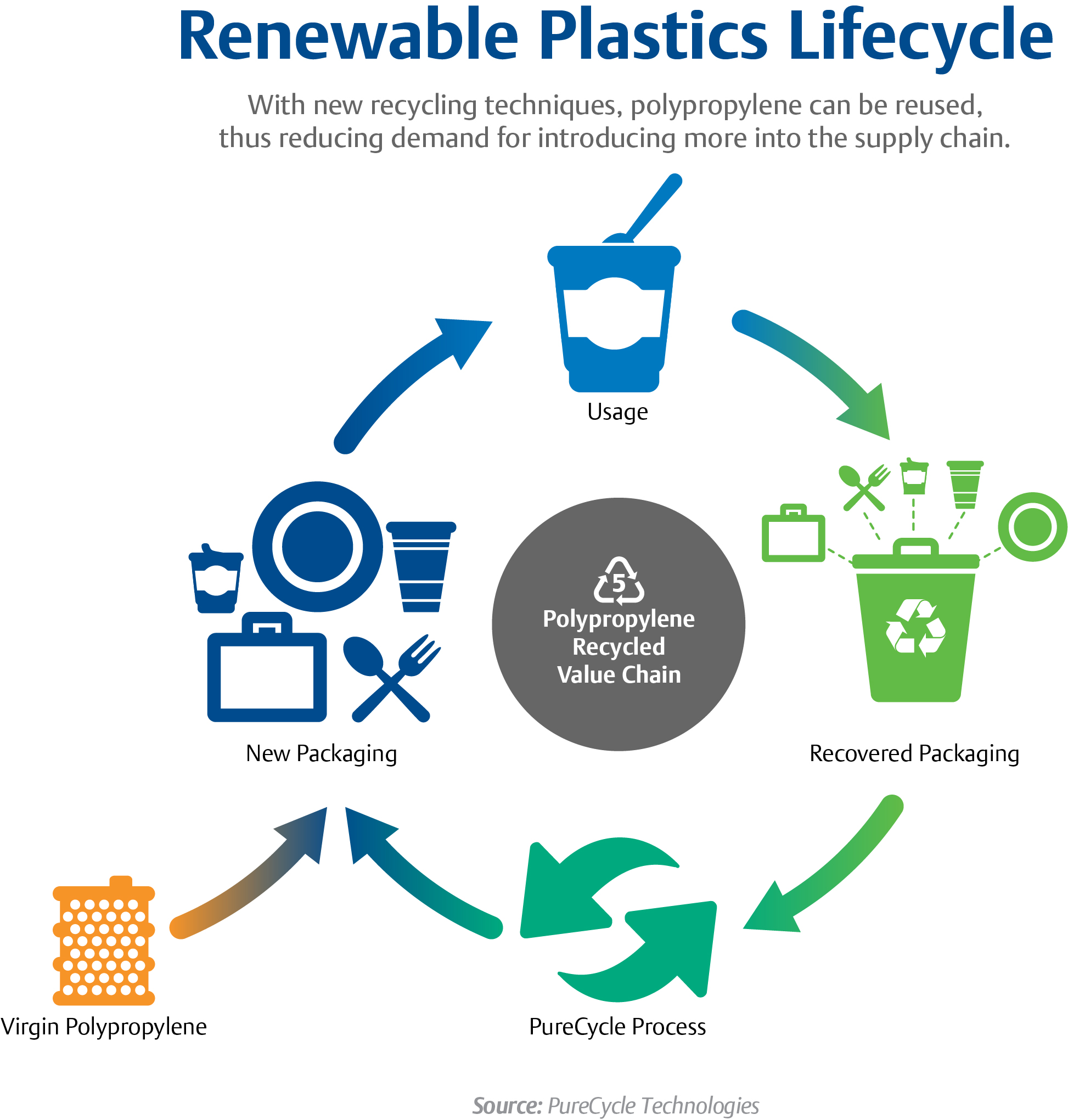 Two companies exemplify the potential of plastics recycling by introducing new ways to work with polypropylene. PureCycle returns the plastics to pure, near-virgin polypropylene, reintroducing them to the plastics economy in like-new form, whereas ReNew ELP reduces mixed plastics down to high-grade chemicals and oils … feedstock for new use cases and applications.