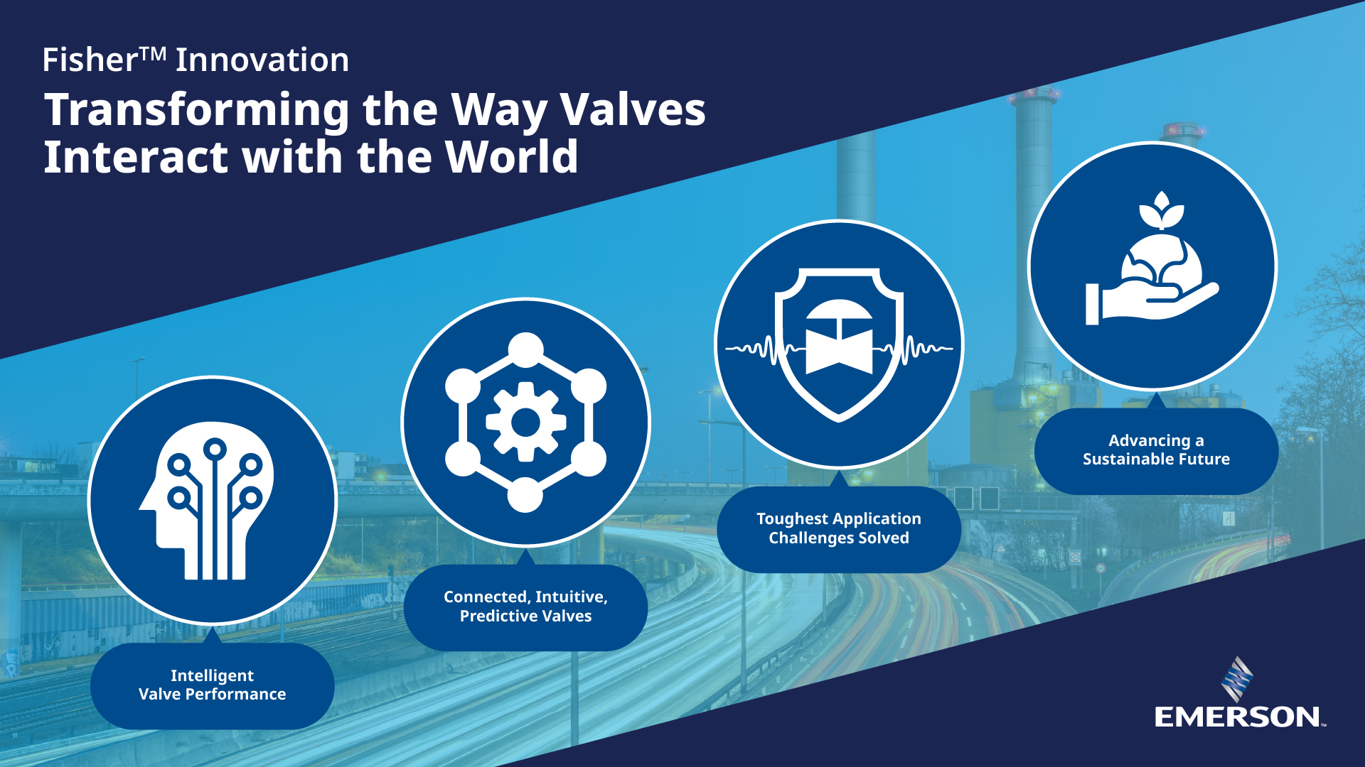 Fisher™ innovations are transforming the way valves interact with the world in the following ways: 1) Intelligent Valve Performance, 2) Connected, Intuitive Predictive Valves, 3) Toughest Application Challenges Solved, and 4) Advancing a Sustainable Future. High Resolution Image
