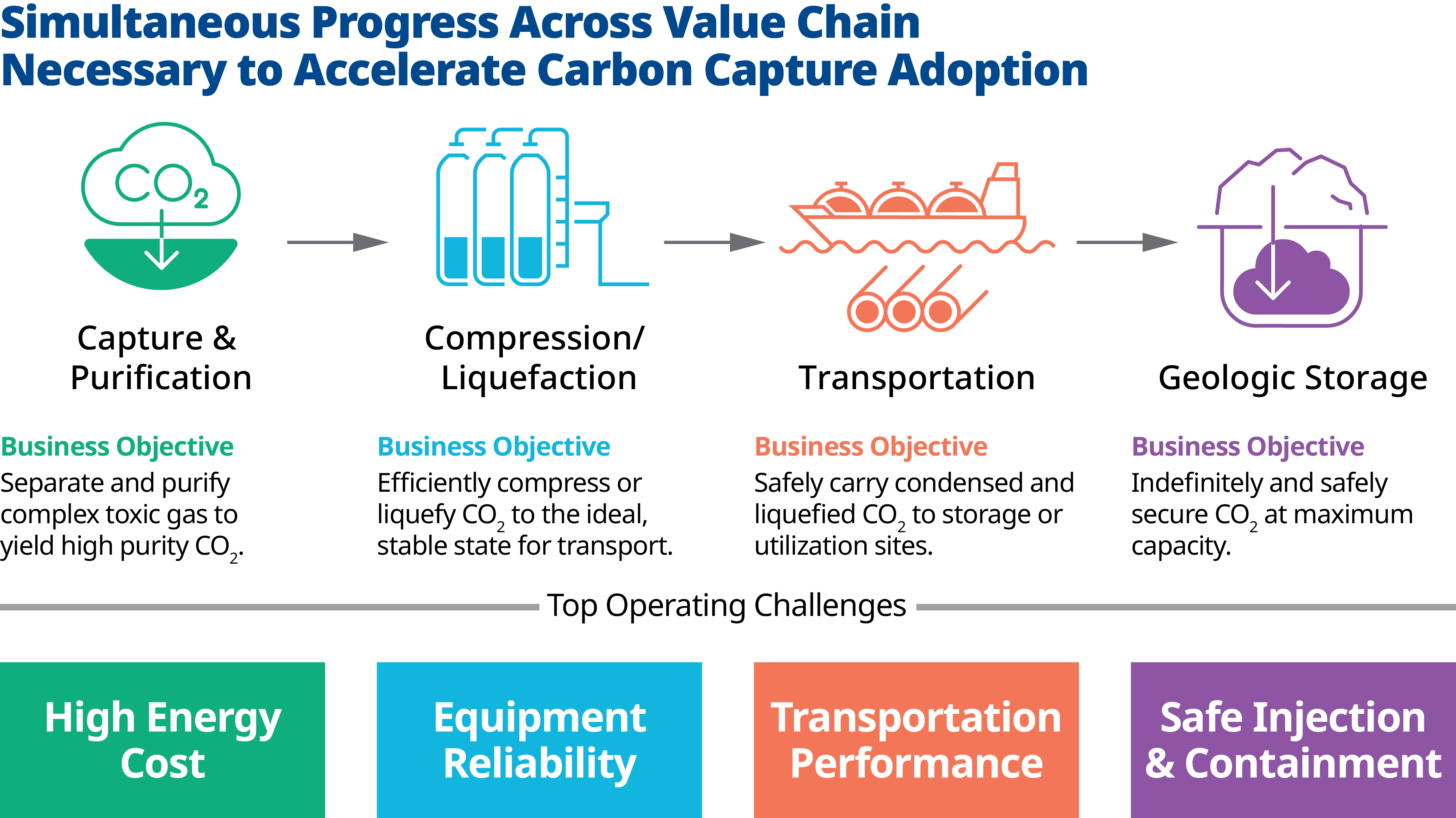 The four segments of the CCS value chain are interdependent, but each involves unique technological challenges, regulatory concerns, risks, and business drivers. Intense collaboration among stakeholders across the entire chain is needed to meet global net-zero goals. Photo courtesy: Emerson.