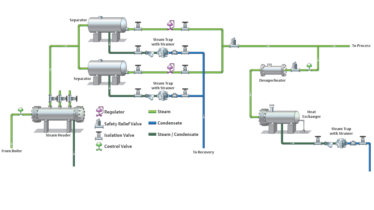 Los colectores de vapor, las líneas de alimentación, las líneas de goteo y las estaciones de reducción de presión son componentes clave del sistema de distribución de vapor. Las trampas de vapor son elementos esenciales que eliminan el condensado y el aire, por lo tanto optimizan la distribución de vapor y reducen los costos energéticos. Los reguladores aseguran que el vapor se suministre a varios procesos a las presiones deseadas.