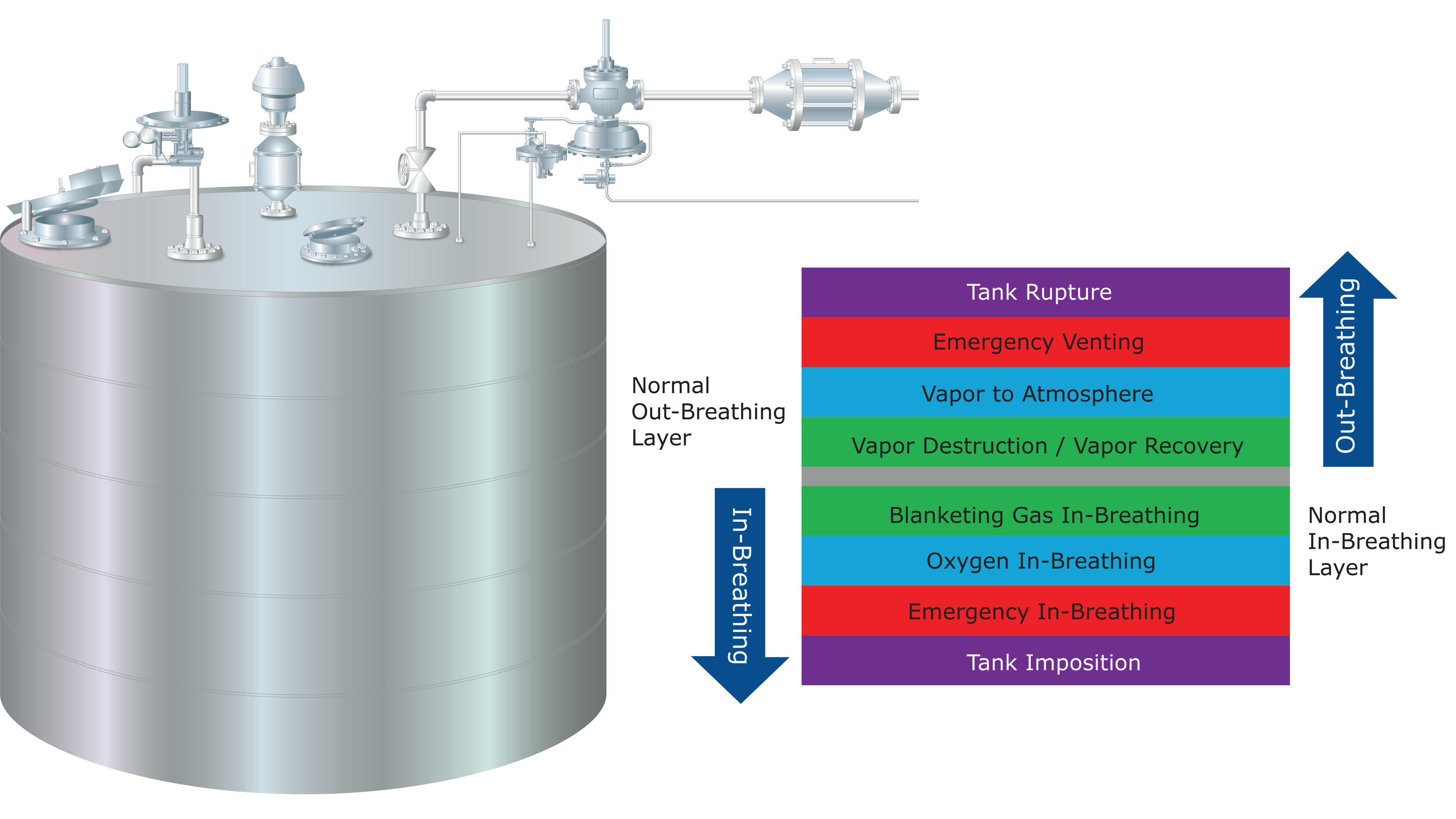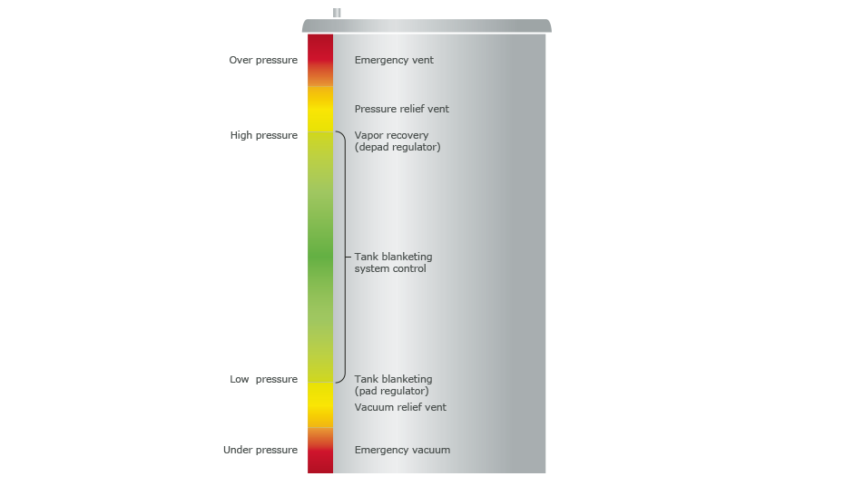 Los cambios normales de presión que se producen en un tanque debido a los cambios de nivel de líquido y temperatura se gestionan mediante venteos de vacío de presión, escotillas y reguladores de inertización de tanques y recuperación de vapor.