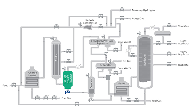 El separador de alta presión caliente (HHPS) corta los productos de reacción pesados y ligeros y recupera el hidrógeno que se evapora durante la purga del reactor. El líquido del producto pesado se envía al fraccionador, al separador o a una combinación de ambos. El líquido del producto liviano se enfría y se inyecta con agua de lavado para absorber el amoniaco (NH3) y el sulfuro de hidrógeno (H2S). La mezcla se enfría aún más antes de ingresar al separador de alta presión fría mediante el intercambiador de gas de reciclaje y el ventilador de aleta (refrigerante del separador de la HHP).