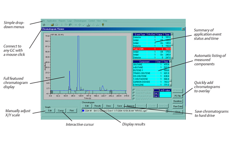 Le logiciel MON2000 peut afficher à l’écran les chromatogrammes courants ou archivés, réduisant ainsi le temps nécessaire à l’exécution de la maintenance de routine des analyseurs.