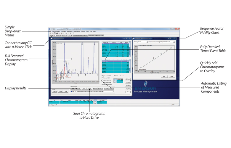 Les chromatographes en phase gazeuse Rosemount d’Emerson sont livrés avec le logiciel MON qui offre aux opérateurs la capacité de facilement configurer, utiliser et gérer l’analyseur localement ou à distance, ainsi qu’une meilleure visibilité sur votre procédé. Parmi les nombreuses caractéristiques du logiciel MON figure la capacité de communiquer sur le réseau de l’entreprise, de stocker en toute sécurité les données critiques et de générer des rapports détaillés, tels que :