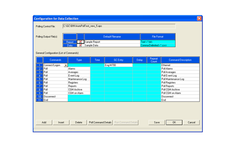 La configuration des chromatographes spécifiques à interroger, la programmation de l’interrogation et les données spécifiques à recueillir de chaque appareil sont définies par l’utilisateur grâce à la configuration des fichiers de contrôle d’interrogation.