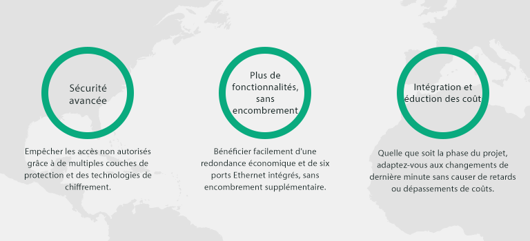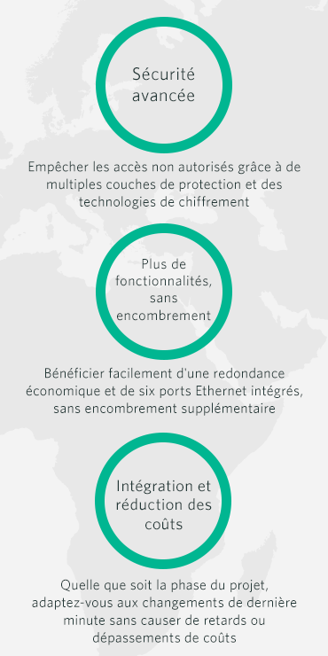 3) Gestion du contrôle de dispositif Ethernet − Grâce aux six ports Ethernet intégrés, de nombreuses applications ne requièrent plus l’utilisation de commutateurs. Les protocoles natifs incluent : serveur OPC UA, client et serveur Modbus TCP et client Ethernet/IP.