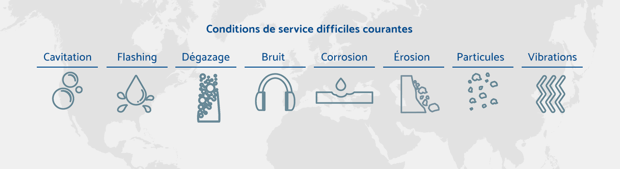 Le dégazage est un phénomène de service difficile dans lequel le gaz dissous dans un liquide de procédé est libéré à mesure que la pression diminue. Le liquide de procédé entre dans la vanne de régulation sous forme de liquide et en sort sous forme de liquide et de gaz. Cet écoulement biphasique produit un excès de gaz et provoque généralement deux types de dommages : la cavitation et l'érosion. Des vibrations et du bruit excessifs peuvent également se produire.