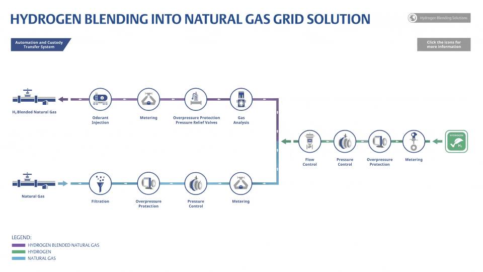 Après avoir été extrait de la terre et raffiné pour être utilisé comme combustible, le gaz naturel entre généralement dans un réseau de grands pipelines de transport qui l’achemine vers les villes et les installations industrielles d’une zone géographique donnée. L’hydrogène peut ensuite être injecté dans les conduites de gaz naturel par le biais de systèmes d’injection à pratiquement n’importe quel point du réseau de transmission ou plus en aval le long des lignes de distribution plus petites des villes individuelles qui servent les utilisateurs finaux commerciaux et résidentiels.