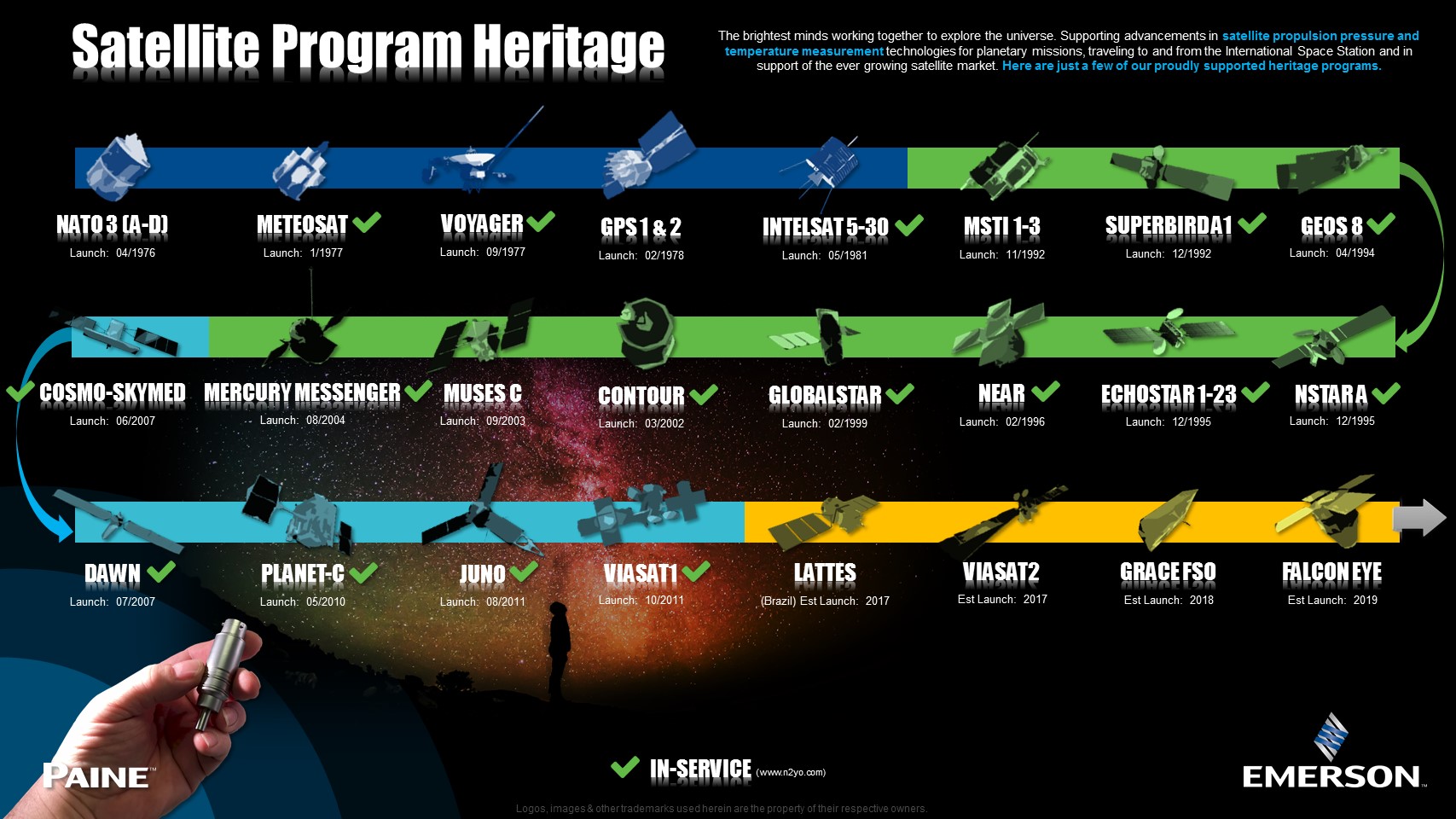 Des ajustements sophistiqués des fusées auxiliaires pour un voyage épique sur Jupiter, jusqu'au réseau mondial sans cesse croissant de satellites, les capteurs Paine™ d'Emerson sont utilisés comme référence pour les ingénieurs développant de nouveaux capteurs personnalisables pour les mesures critiques de leur mission.