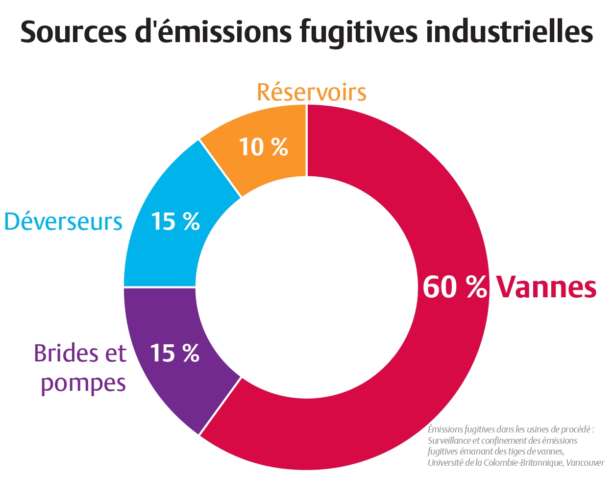 Une des formes les plus insidieuses d’émissions est connue sous le nom d’émissions « fugitives », lorsque le confinement des gaz et des liquides toxiques est perdu à cause de fuites de vannes et de réservoirs, de tuyauteries corrodées ou de raccordements mécaniques défectueux. Le méthane, un puissant gaz à effet de serre responsable d’une grande partie du réchauffement de la planète, est au premier rang des préoccupations. En revanche, la prévention des émissions de méthane est un des moyens les plus rapides et les plus économiques d’atteindre les objectifs en matière de climat. Sans avertissement et souvent avec une détection tardive, les plus grandes sources de méthane et d’autres émissions fugitives industrielles sont souvent invisibles de tous : 60 % proviennent des vannes, suivies par les brides et les pompes, les soupapes de sécurité et les bacs de stockage.