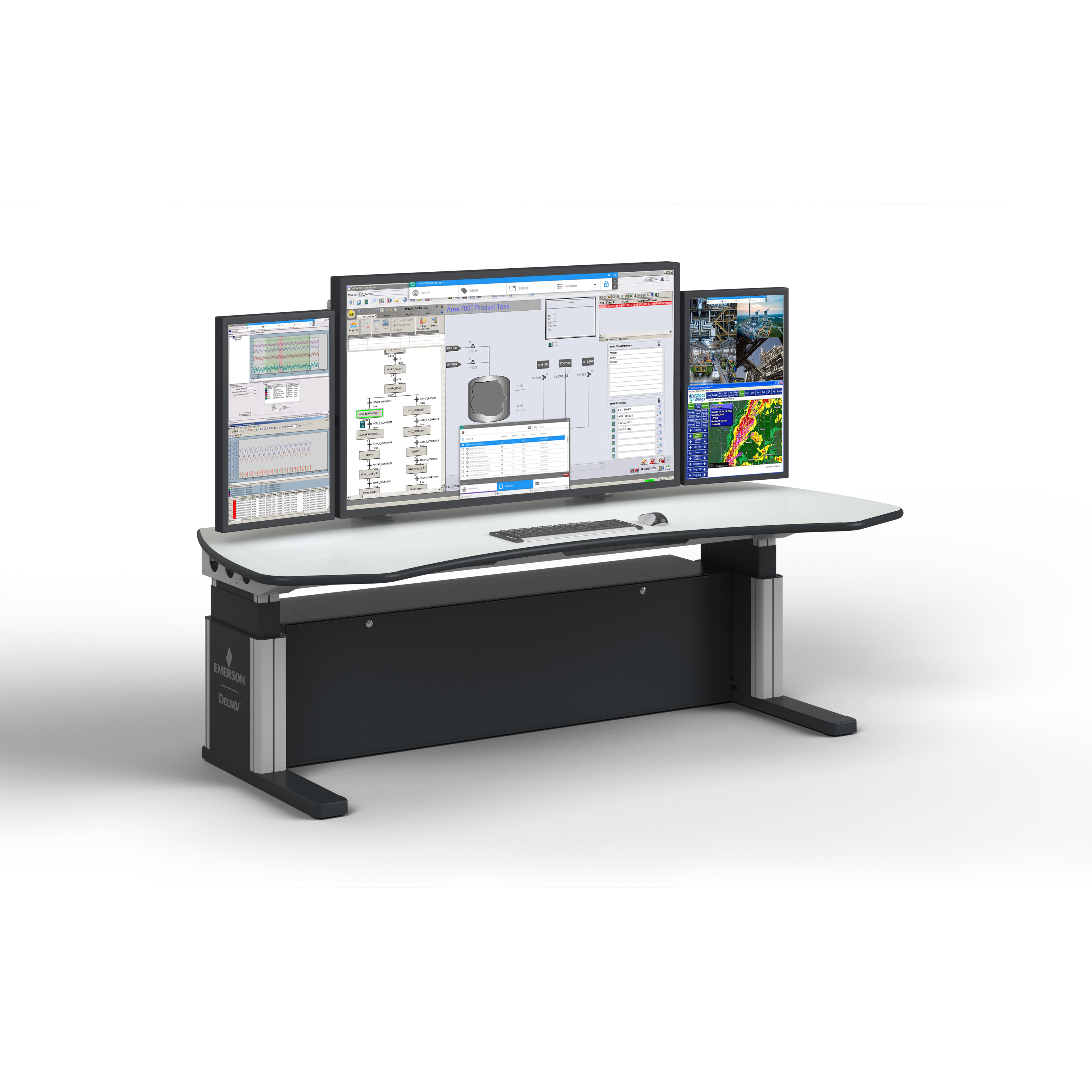 • A height-adjustable, electric sit-stand operator console with one 58-inch UHD monitor and two 27-inch HD monitors, and a spacious, high-pressure laminate 24/7 desk work area