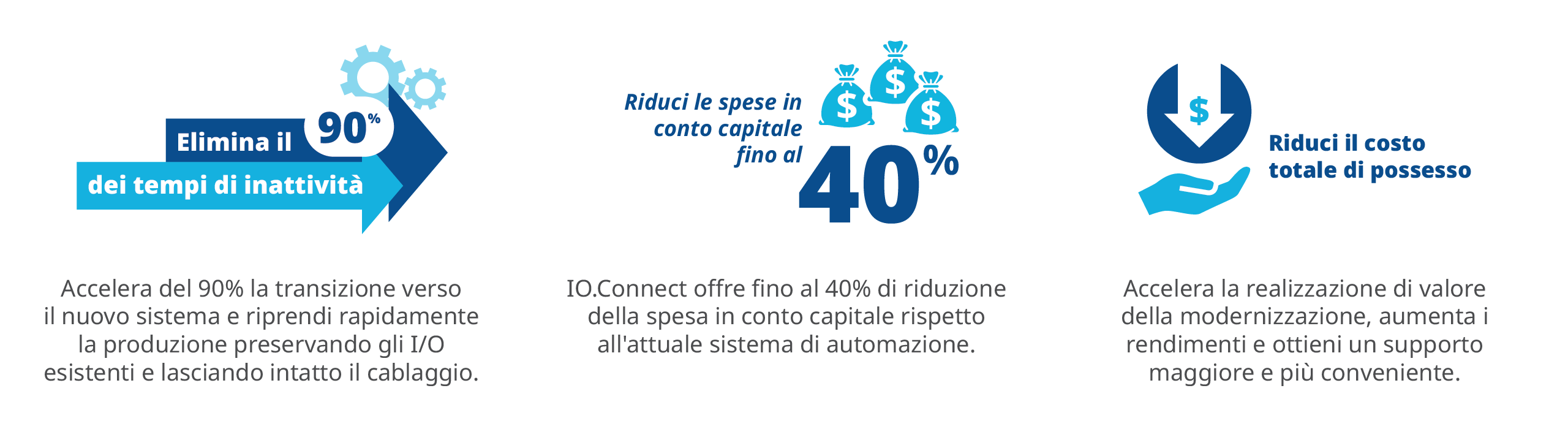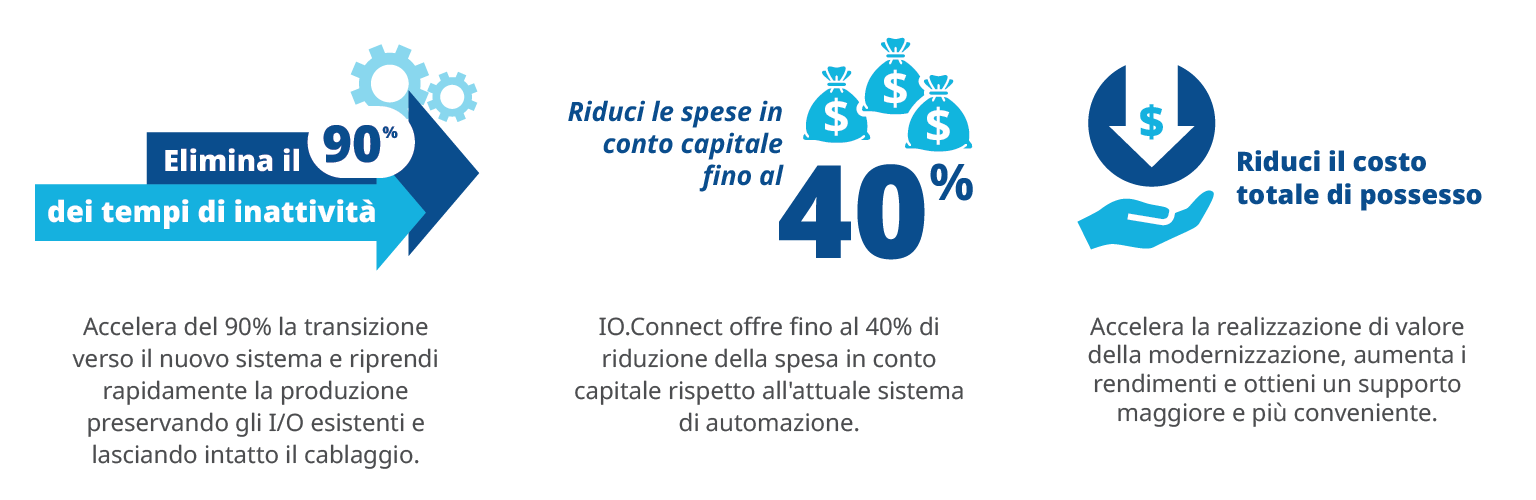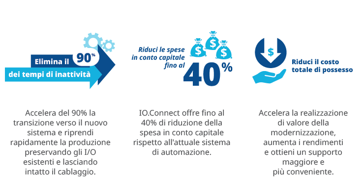 DeltaV™ IO.Connect aiuta gli impianti a effettuare la transizione dai sistemi di controllo legacy al DCS DeltaV, in modo semplice e sicuro, riducendo al minimo i tempi di inattività e i rischi. Ora, gli impianti possono utilizzare in modo flessibile il capitale per ridurre i costi operativi, ottenere un ROI immediato, realizzare la trasformazione digitale e prepararsi con fiducia al futuro.