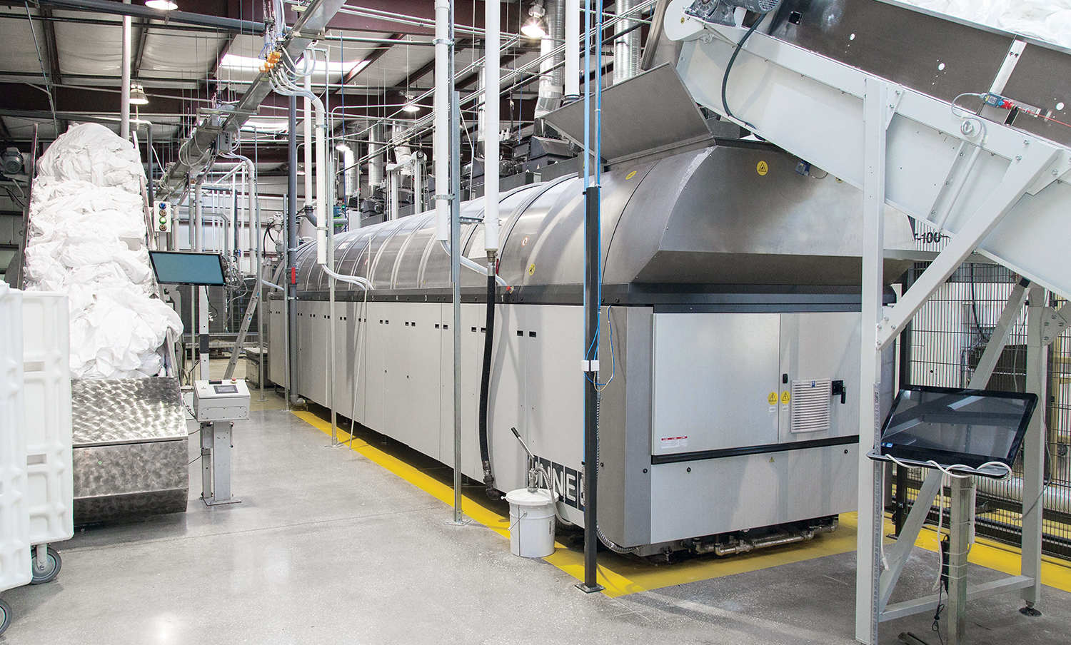 Un intero batch di capi è pressato tra due grandi piastre che si chiudono per strizzare l’acqua, che viene quindi scaricata.