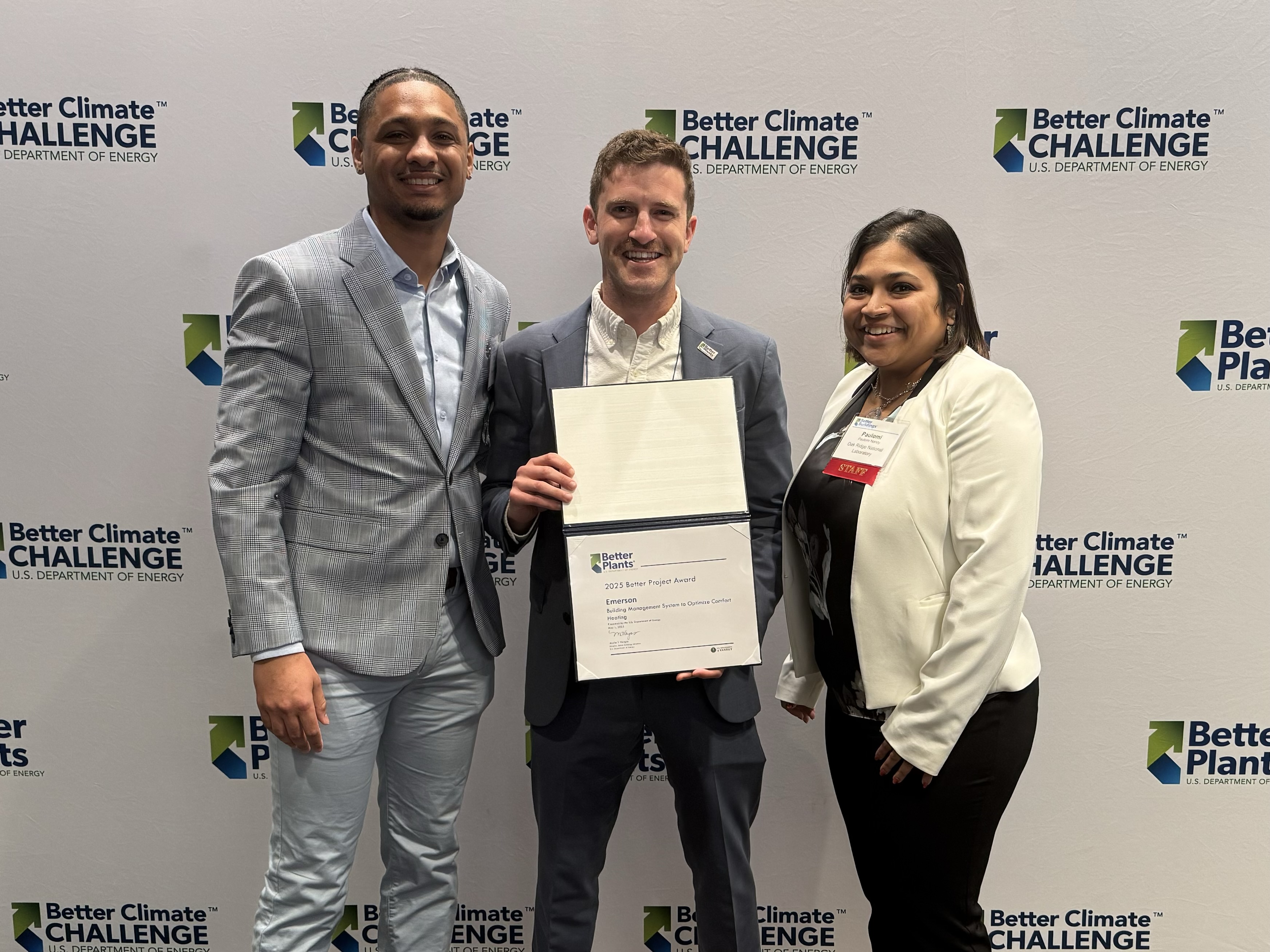 Da sinistra a destra: Zion Taylor, sustainable energy analyst, Emerson; Mike Barkan, sustainable energy analyst, Emerson; Paulomi Nandy, better buildings, technical account manager, Department of Energy. Immagine ad alta risoluzione