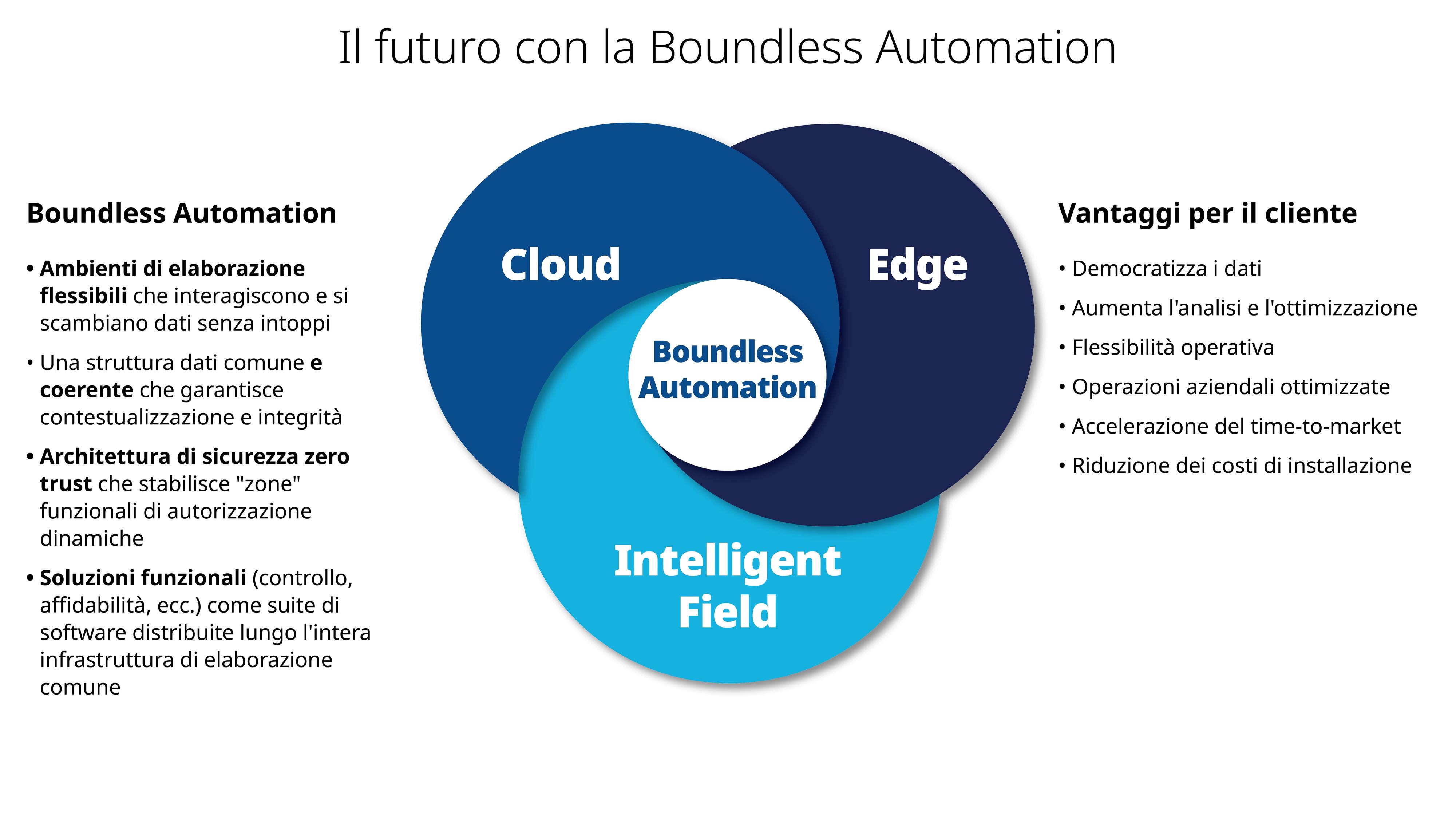 Boundless Automation℠ è la visione di Emerson per una piattaforma di automazione industriale che integri le operazioni intelligenti in campo, all'edge e nel cloud per garantire visibilità, ottimizzazione e operazioni autonome in tutta l'azienda.