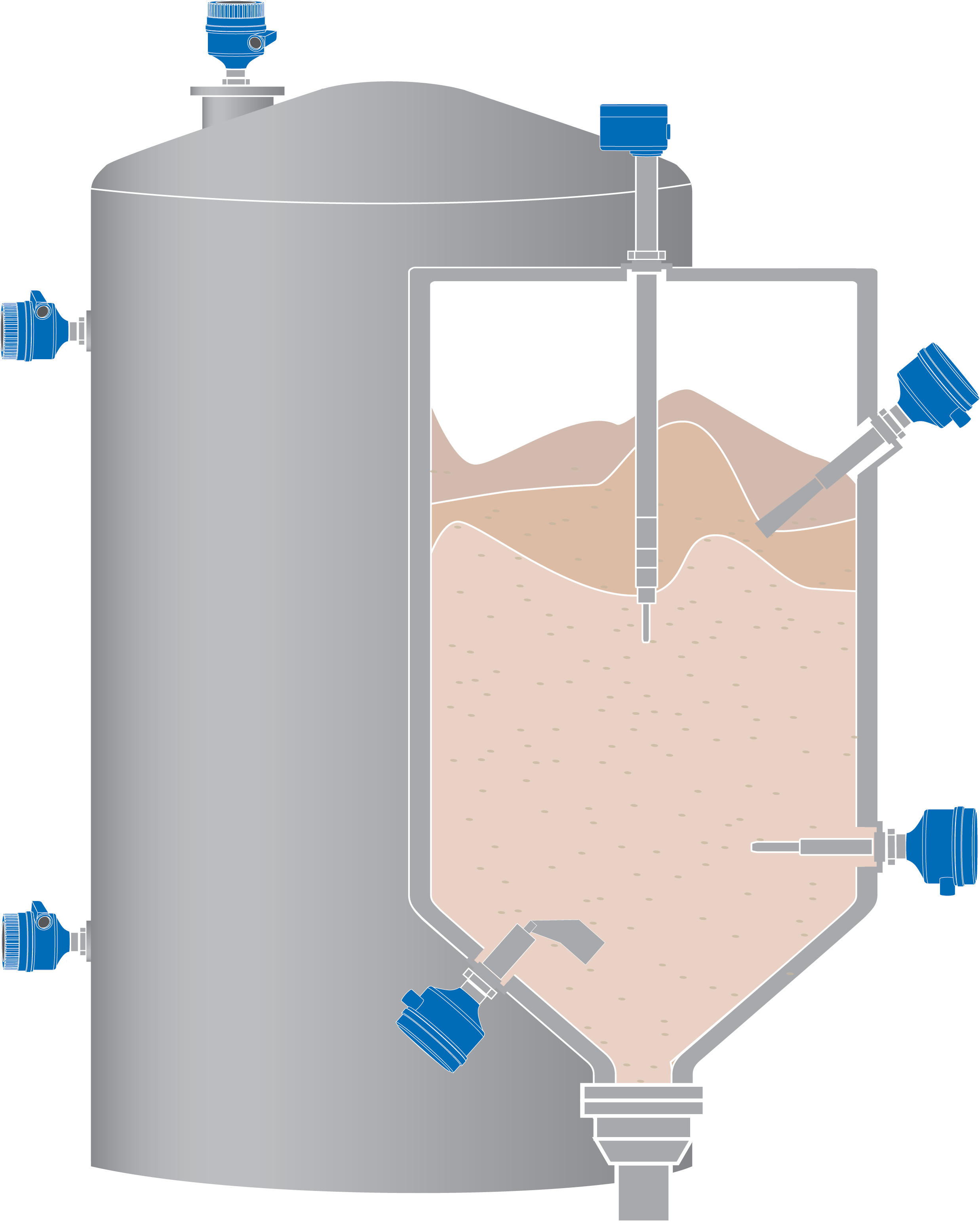 Czujniki poziomu materiałów sypkich składają się z kilku technologii, które nie wymagają konserwacji i nadają się do wykrywania pełnego lub pustego zbiornika (również na żądanie) dla wszystkich mediów składowanych masowo we wszystkich rodzajach zbiorników.