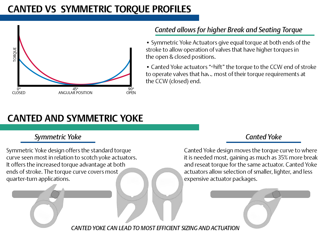 Os atuadores Scotch Yoke caracterizam-se pelo torque alto no início e no fim de cada operação, o que aumenta a segurança, especialmente em aplicações em que uma válvula permanece estacionária por longos períodos. Comparado com pinhão e cremalheira, um Scotch Yoke usando o mesmo furo de cilindro e a mesma pressão de suprimento de ar desenvolve um torque maior.