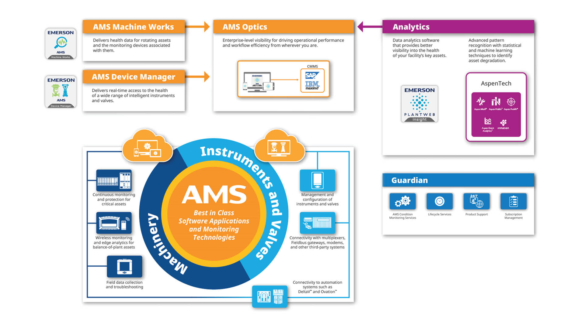 O portfólio AMS da Emerson permite a visão da Emerson para Boundless Automation ao unificar dados, sistemas e pessoas em toda a empresa para alcançar melhorias em segurança, produção, confiabilidade, sustentabilidade e capacitação da mão de obra.