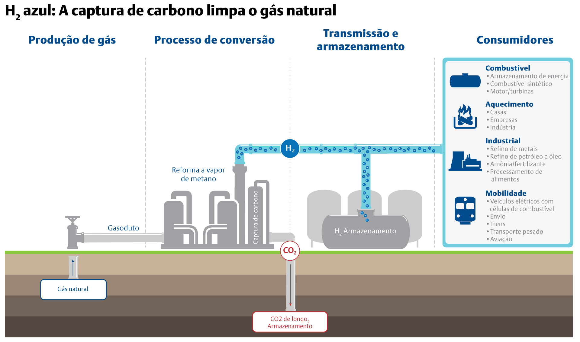 Há mais de 3 milhões de milhas de dutos de gás natural apenas nos Estados Unidos, e muitos milhões em todo o mundo. Apesar das recentes flutuações de preços, a infraestrutura de gás natural fornece um acelerador para a economia do hidrogênio. Com uma grande oferta de recursos naturais, há uma oportunidade de converter moléculas de gás em hidrogênio mais próximo de onde é necessário. E, ao contrário do hidrogênio cinza, o hidrogênio azul proveniente do gás natural inclui captura de carbono e processos de armazenamento subterrâneo permanente para evitar a liberação de CO2 na atmosfera.