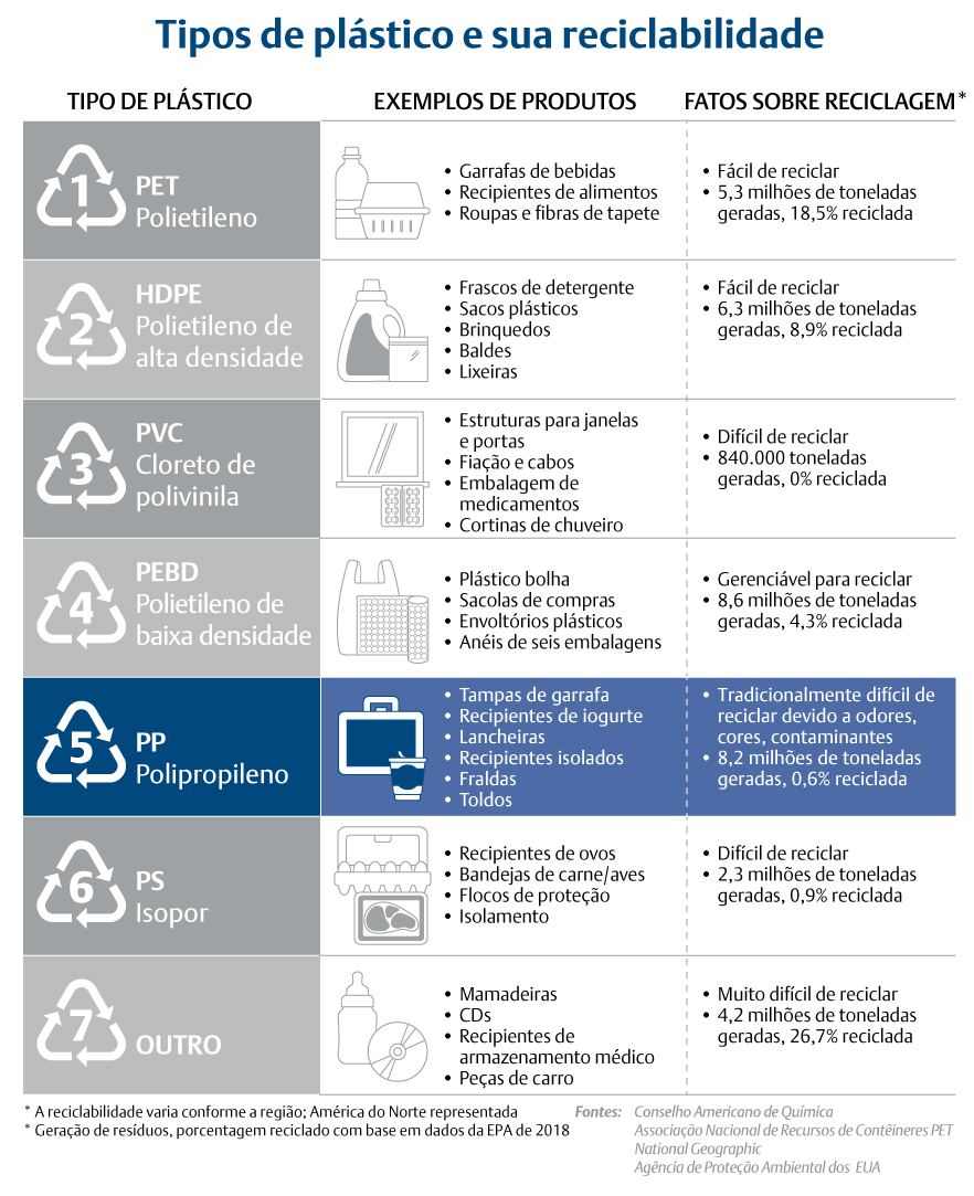 Esse plástico, polipropileno, raramente é reciclado. Também conhecido como Resina Código 5, é usado em tudo, de garrafas de xampu e copos plásticos até peças automotivas e dispositivos médicos. Remover contaminantes, cores e odor desses plásticos para reciclá-los é tradicionalmente caro e complicado, muitas vezes produzindo resultados ruins.