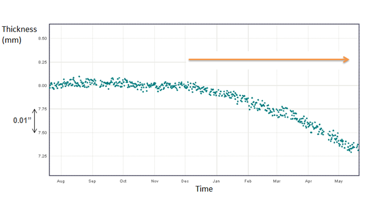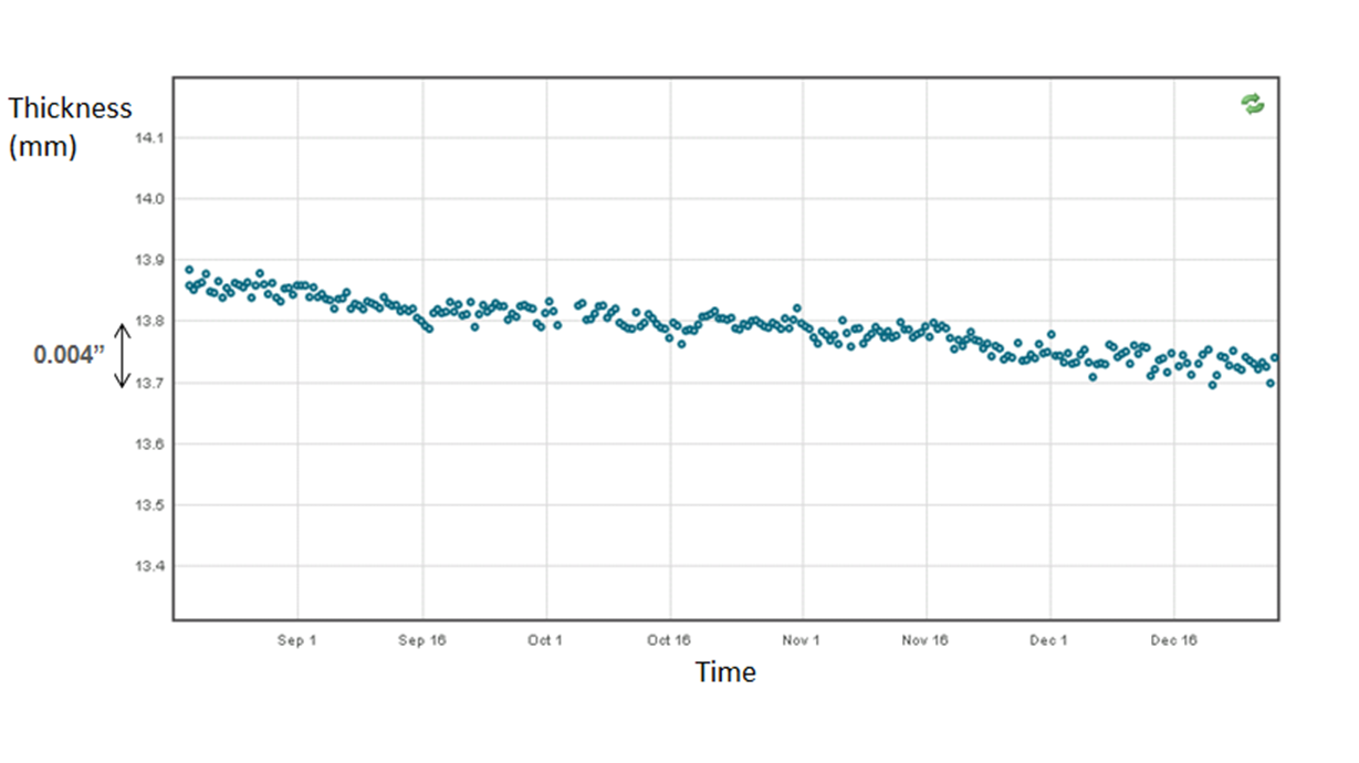 Этот пример измерений в одной точке в течение нескольких месяцев подтверждает потерю металла с постоянной скоростью. Это позволяет прогнозировать толщину стенки, если условия процесса, стратегия сдерживания коррозии и обратная связь остаются неизменными.