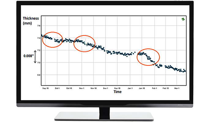 Стационарное размещение датчиков позволяет значительно повысить качество измерения толщины стенок, исключив множество ошибок, связанных с контролем вручную. Частоту измерений любого из датчиков можно перепрограммировать в любой момент. При частоте измерения два раза в день скорость коррозии/эрозии может быть определена быстро и точно в пределах 0,1 мм/год.