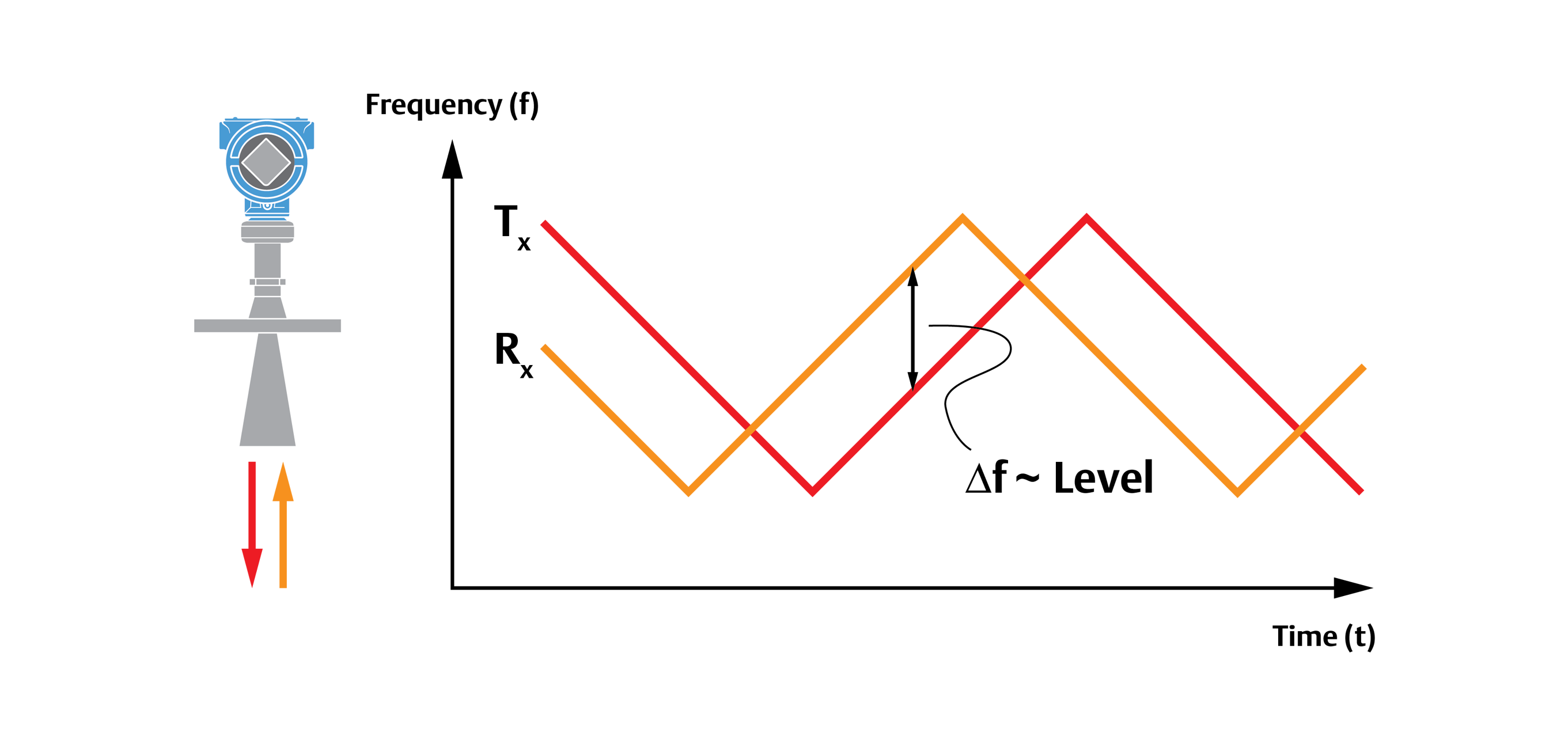 Радиолокационные сигналы непрерывно передаются к поверхности среды с микроволновой частотой, модулированной по диапазону. Уровень среды пропорционален разности частот между переданным и принятым сигналами.