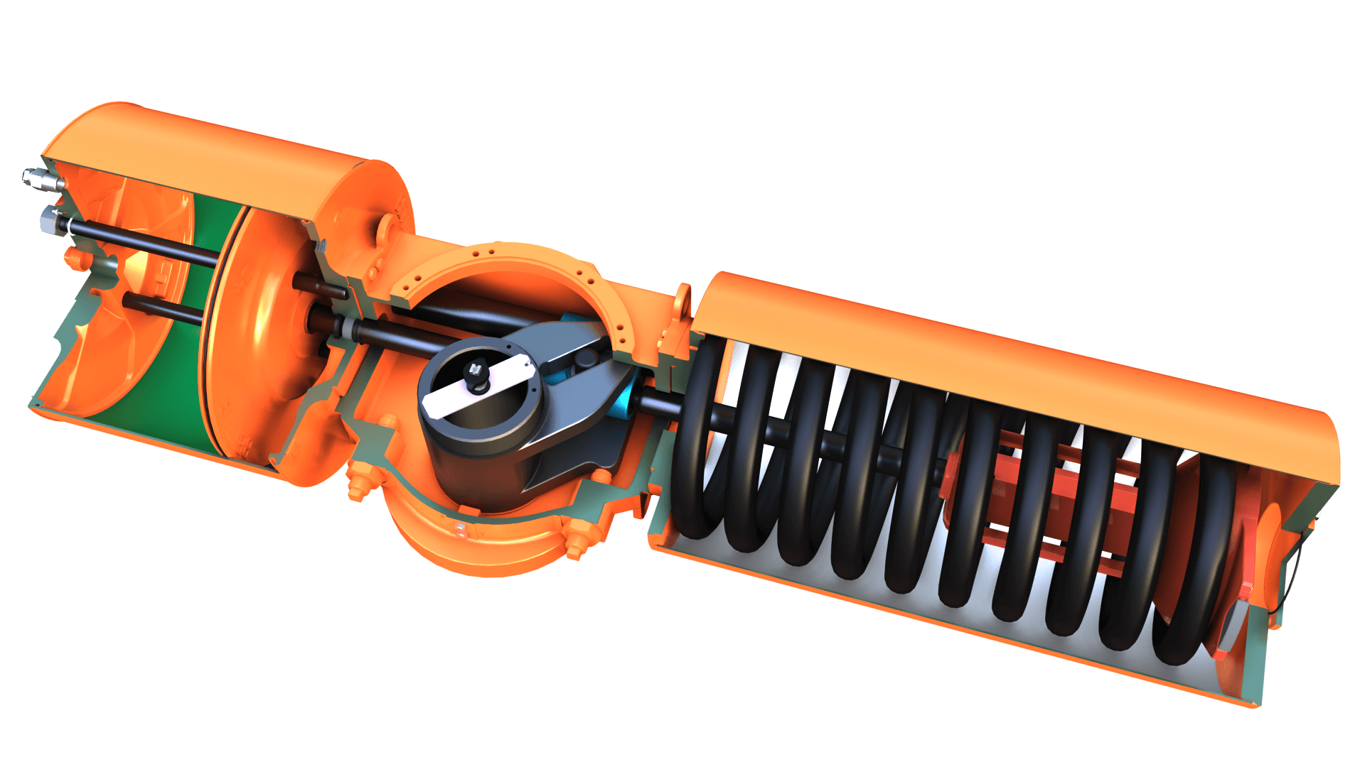 Приводы доступны в двух конструкциях: с пружинным возвратом и двойного действия. Пружинный механизм обеспечивает срабатывание привода в заданное положение (открыт или закрыт) при потере источника питания.