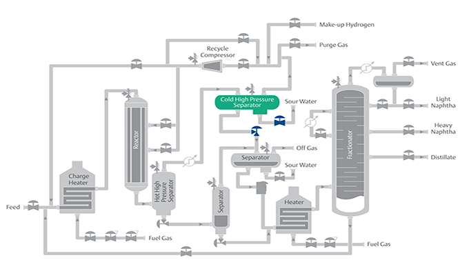 Горячий сепаратор высокого давления (HHPS) разделяет тяжелые и легкие продукты реакции и извлекает водород, испарившийся из реактора в процессе спуска. Тяжелая жидкость направляется в ректификационную колонну, отпарную колонну или на обе установки. Легкий продукт охлаждается и впрыскивается с промывочной водой для впитывания аммиака (NH3) и сероводорода (H2S). До ввода в холодный сепаратор высокого давления производится дальнейшее охлаждение жидкости с помощью газообменника рециркуляционного газа и лопастного вентилятора (см. вентилятор сепаратора HHP).