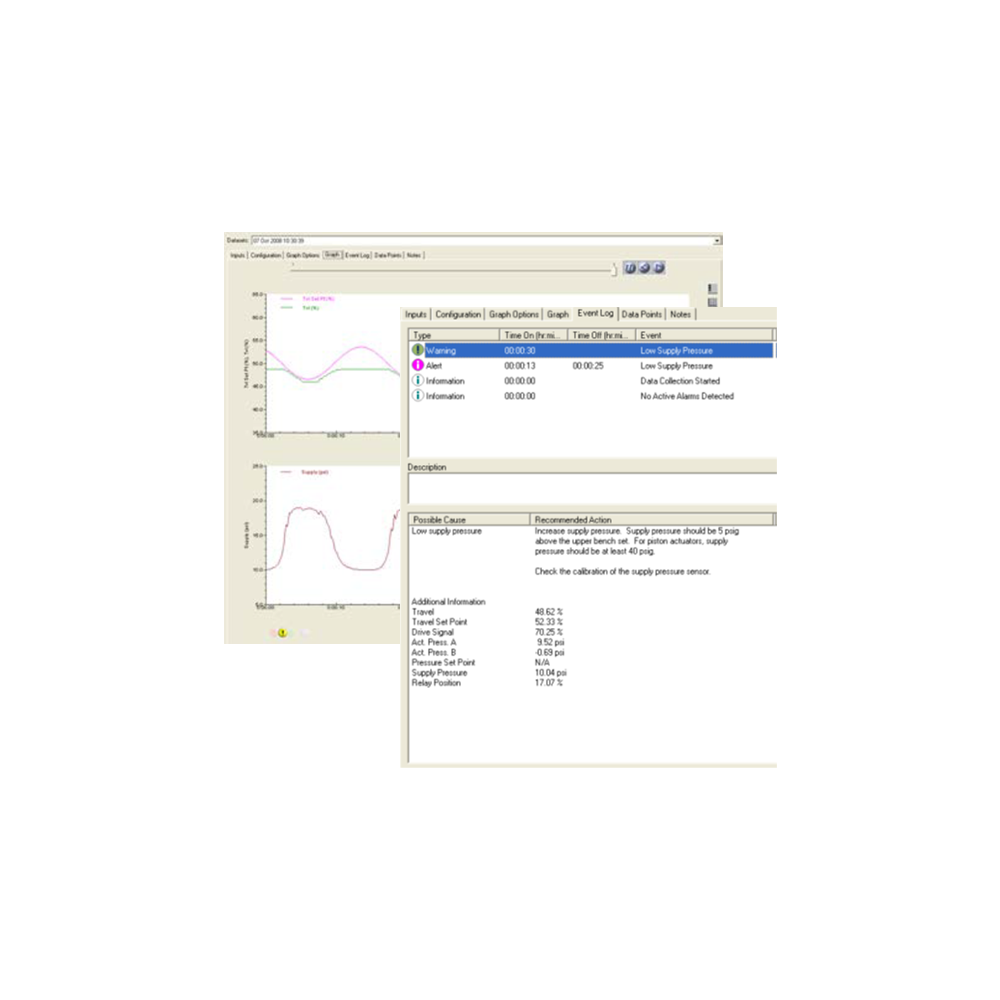 Диагностика характеристик постоянно анализирует клапанный узел и собирает данные, не нарушая работу регулирующего клапана. Программное обеспечение помогает локализовать утечки воздуха; выявлять трение в механизмах клапанов и обнаруживать мертвые зоны клапанов; оценивать качество воздуха КИП; выявлять ослабленные соединения и препятствия для движения рабочей среды, а также проводить калибровку клапанов. При обнаружении проблемы диагностика предоставляет описание и серьезность проблемы, ее возможную причину и рекомендуемые действия. Диагностические тесты производительности доступны по запросу пользователя или по заранее выбранному ежедневному, еженедельному, ежемесячному или ежегодному графику.