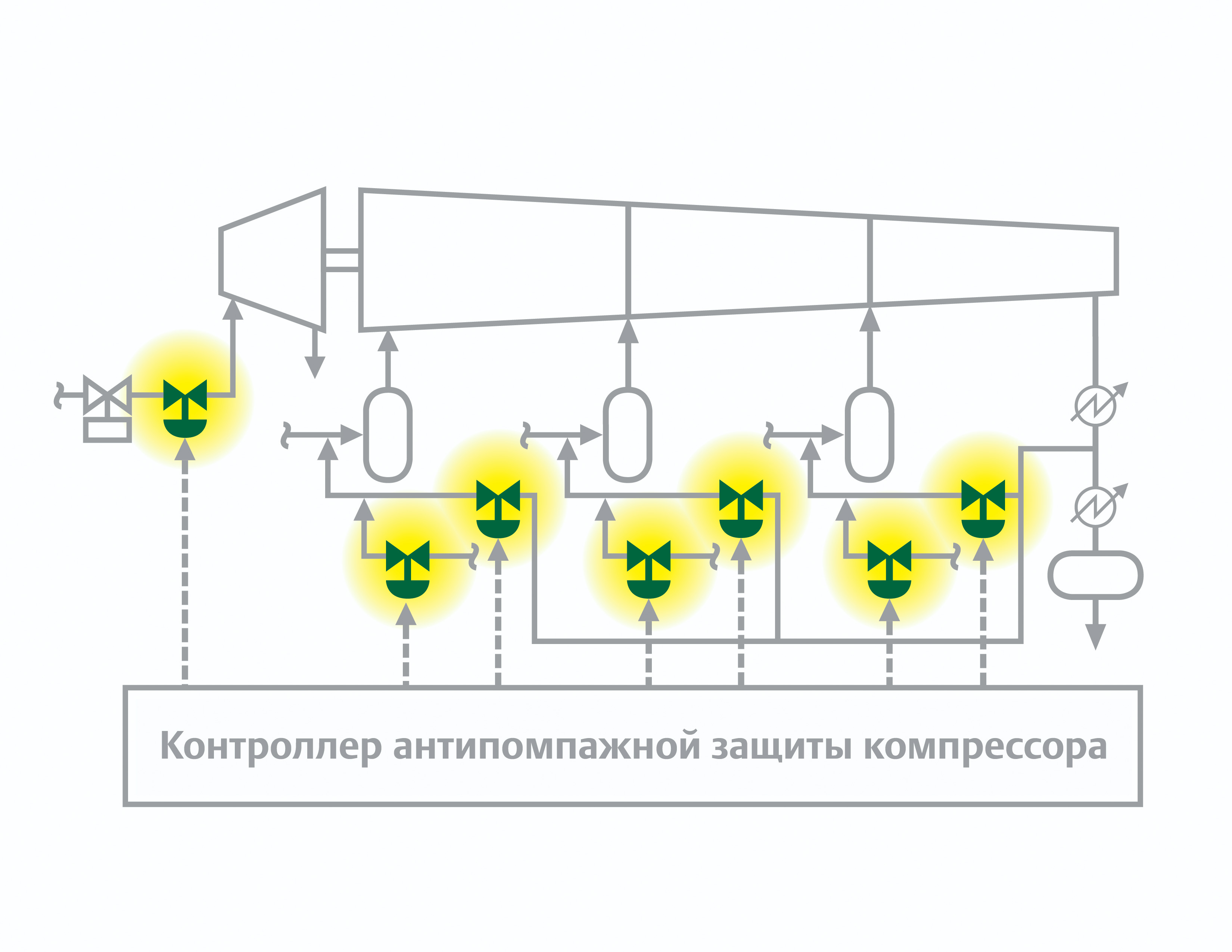 Эти клапаны обнаруживают, когда степень сжатия среды приближается к помпажу, и принимают соответствующие меры для изменения движения рабочей точки в направлении границы помпажа. Клапан уменьшает давление в камере и увеличивает поток через компрессор, что стабилизирует рабочие условия. Обычно это достигается путем открытия регулирующего клапана в линии рециркуляции и возврата нагнетаемого газа на вход компрессора через систему охлаждения на входе. Результирующее увеличение объемного расхода на входе в компрессор отодвигает рабочую точку от помпажа.