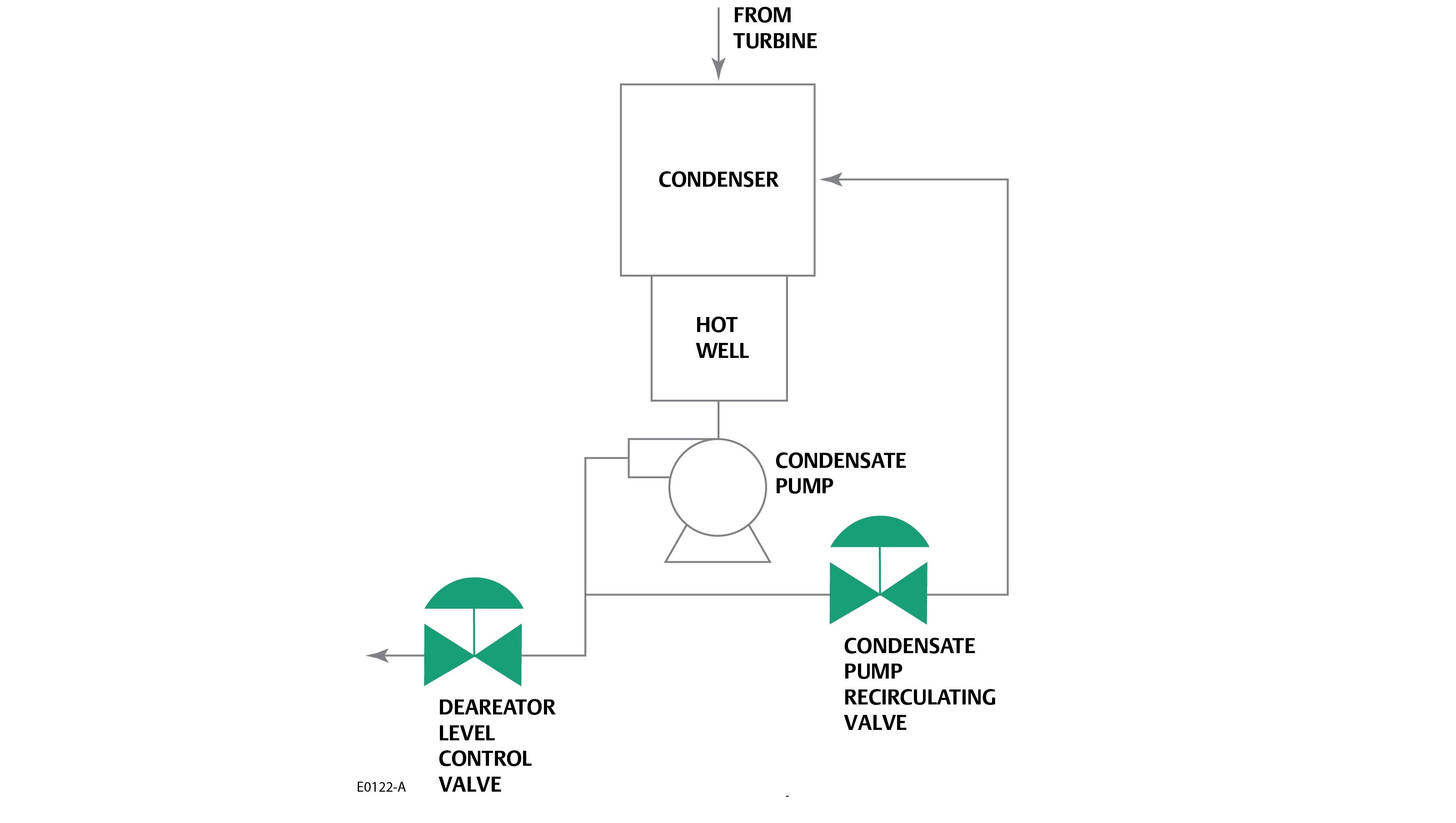 В конце паросилового цикла вода конденсируется обратно в жидкое состояние. Затем центробежный насос перегоняет эту воду в нагреватели, а затем обратно в котел. У всех центробежных насосов минимальный расход, что позволяет им избежать перегрева и кавитации. Клапан регулирует движение потока во втором контуре из выходного отверстия насоса в более низкую точку давления. Этот поток во втором контуре помогает предотвратить перегрев и кавитацию. Выберите этот клапан, чтобы предотвратить кавитацию или противостоять ей.