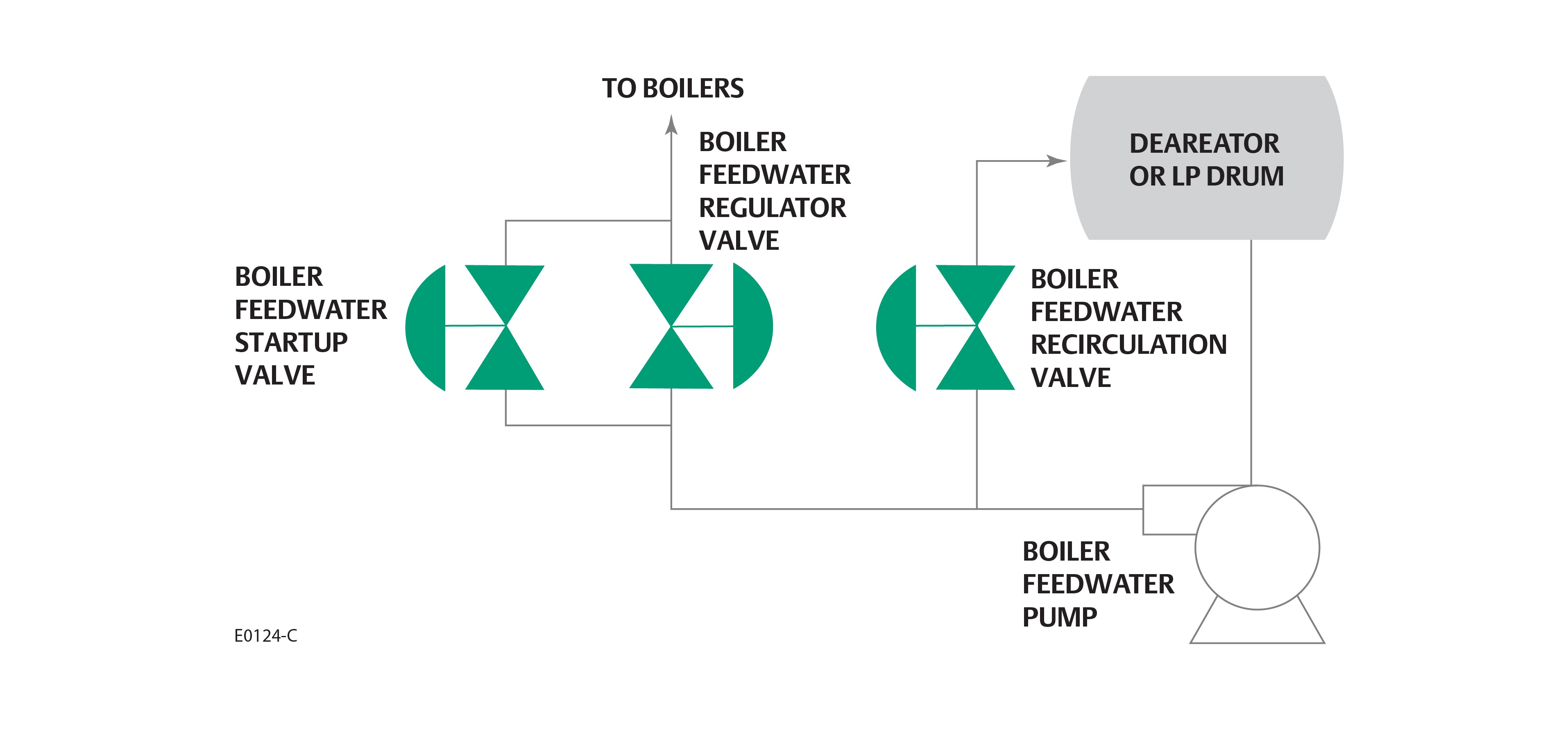 Насосы подачи воды дают воде, поступающей в котел, высокую энергию в отношении потока и давления. Для поддержания стабильной работы и избежания внутренней кавитации центробежным насосам необходим минимальный расход. Если состояние системы использует расход меньше минимума насоса, то регулирующий клапан пропускает поток во втором контуре из отверстия насоса обратно в восходящий системный поток насоса. Необходимый расход системы достигнут, что позволяет поддерживать насос в рабочем состоянии. Во время предотвращения кавитации должен быть выбран клапан для регулирования перепадов давления (например, 6 000 фунт/кв. дюйм).