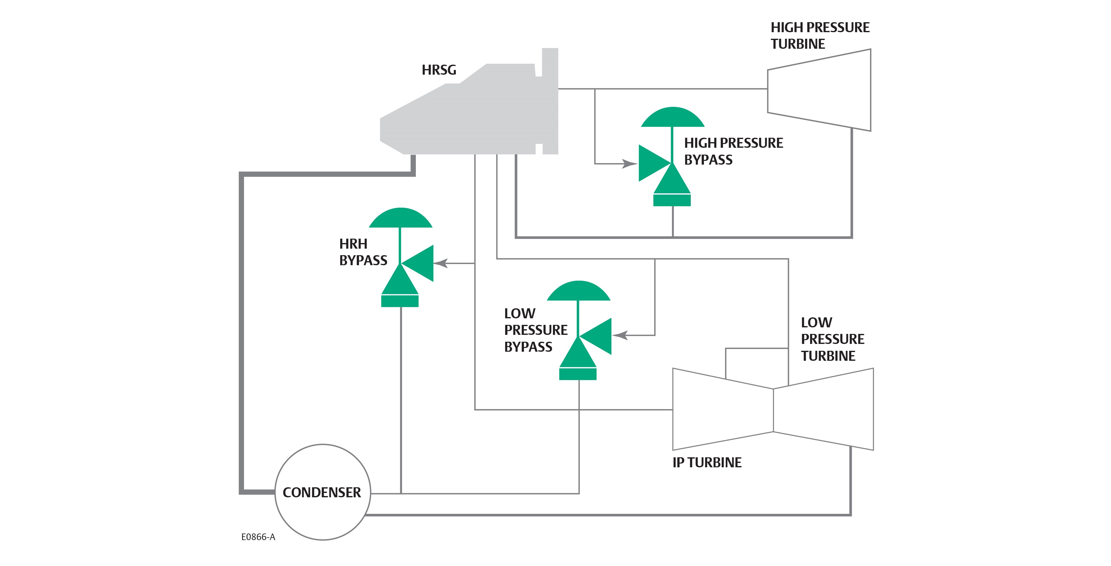 Во время запуска, остановки и в аварийных условиях пар, обычно отправляемый в турбины, перепускается через эти клапаны в конденсатор или атмосферу. Благодаря этому подача энергии из турбин может быть сокращена, а пар рециркулирован. Данный клапан должен обеспечивать снижение шума, поддержку высокого потока и высокого перепада давления и при этом быть пригодным для высоких перепадов температуры.
