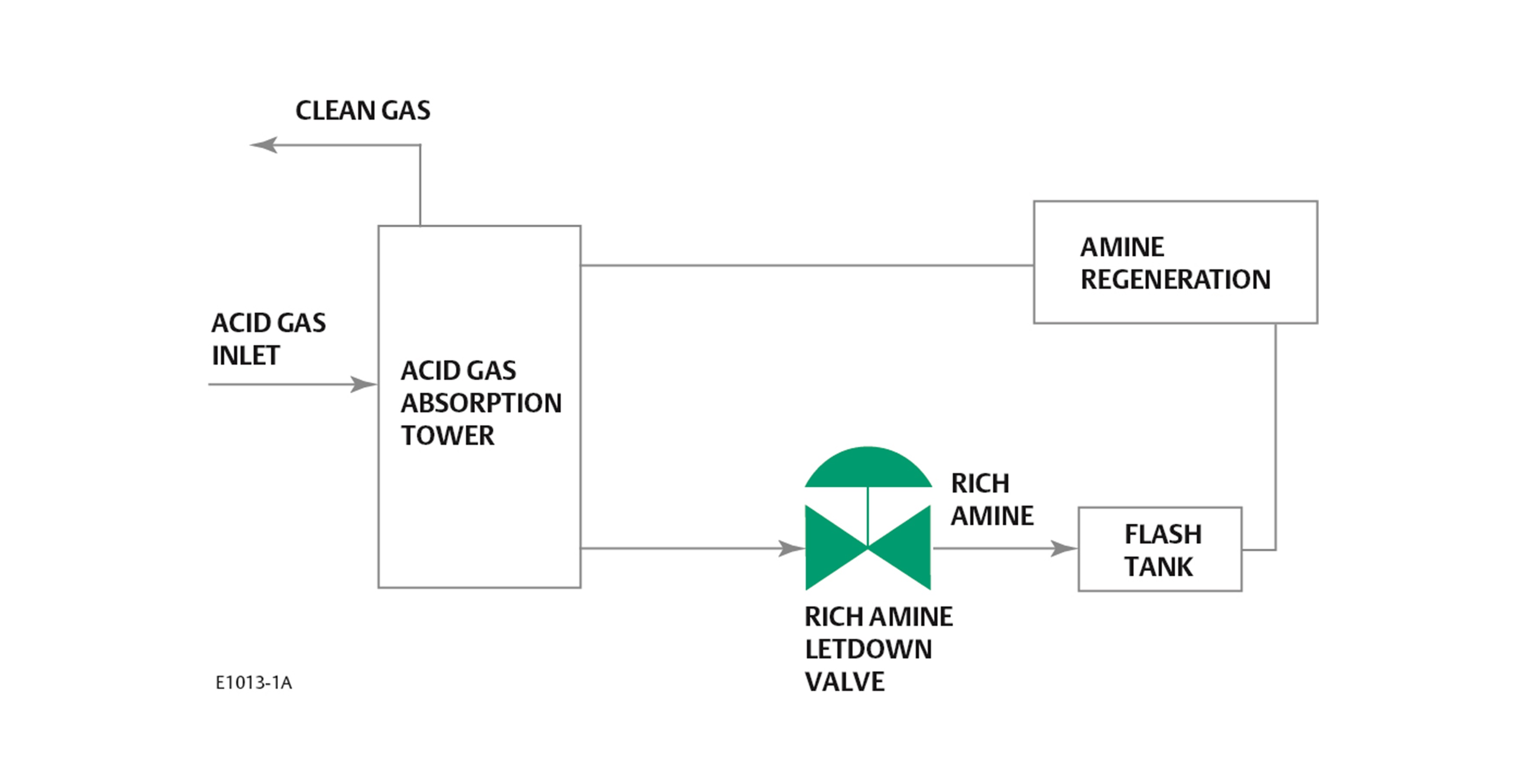 Амины и похожие химические продукты часто смешиваются с необработанными промышленными газами для удаления кислых газов (H2S, CO2), как при подготовке необработанного природного газа для использования в переработке нефти. Жидкий амин поглощает кислые газы. Регулирующий клапан снижает давление амина/раствора кислоты, и кислые газы выпадают из раствора. Это первый шаг в замкнутом контуре, в рамках которого жидкий амин регенерируется для следующего цикла по удалению кислого газа.