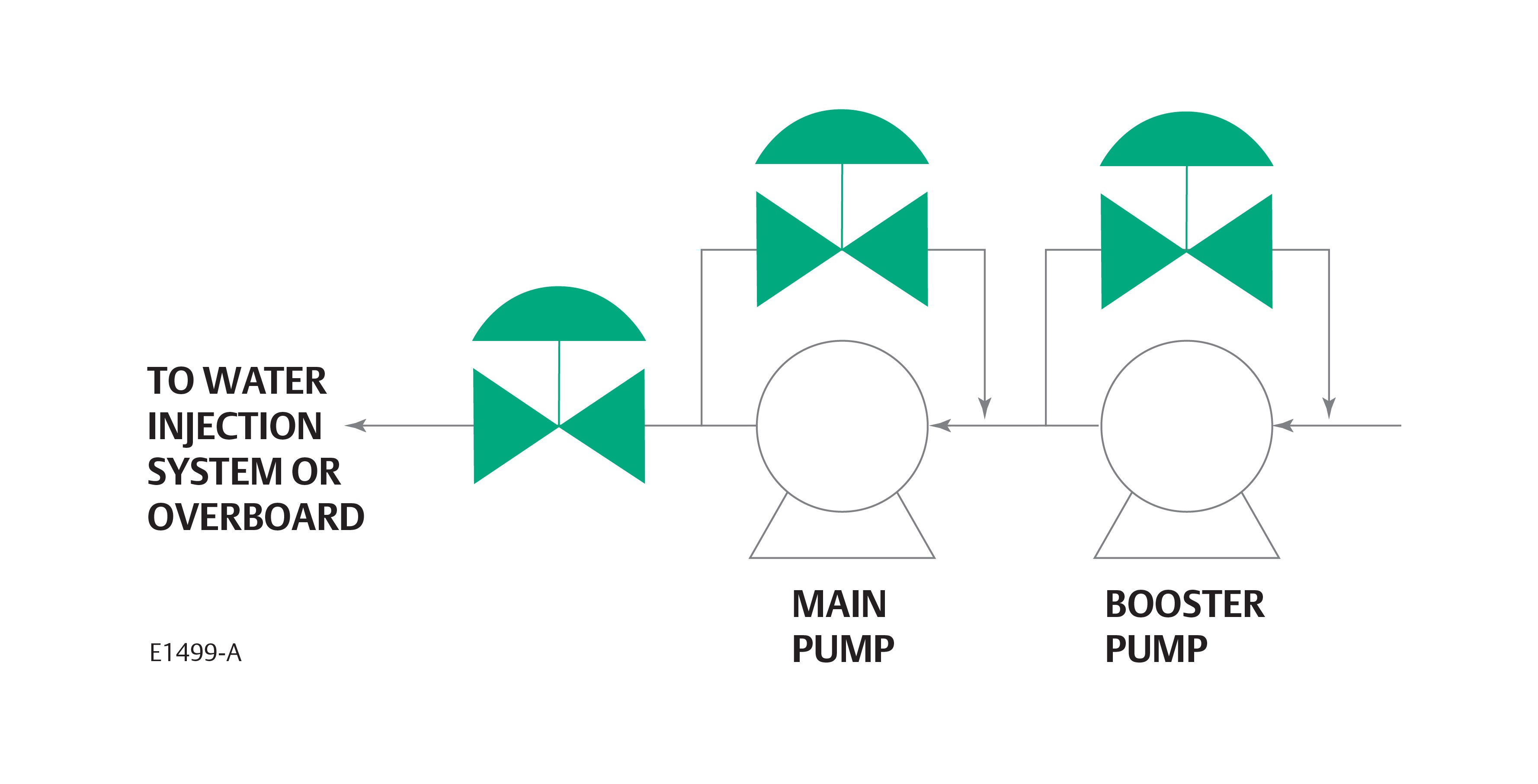 Насосы для нагнетания воды поставляют большие потоки воды под высоким давлением для интенсификации добычи нефти. Вода нагнетается в нефтяной пласт в ключевых местах для поддержания давления пласта и перегона нефти к выкидным линиям. Чтобы не повредить поверхность раздела вода-нефть, необходимо внимательно регулировать давление и поток. От расположения клапанов зависит, попадет ли байпас за борт или в резервуар с добываемой водой. Для поддержания стабильной работы и избежания внутренней кавитации центробежным насосам необходим минимальный расход. Если состояние системы использует расход меньше минимума насоса, то регулирующий клапан позволяет потоку во втором контуре поддерживать минимальный поток и предотвращать повреждения насоса. Клапан должен обработать связанный потенциал кавитации.