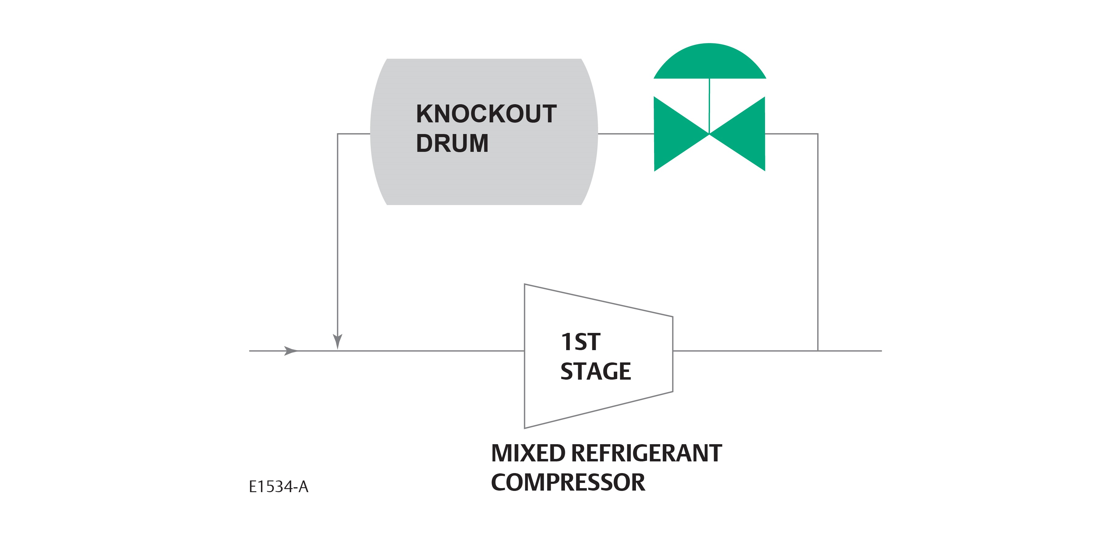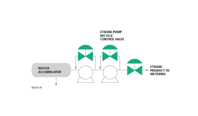 Этот клапан рециркулирует поток через основной насос для этана, когда необходимо предотвратить кавитацию. Как правило, он используется при вводе в эксплуатацию и в начале работы, когда устройство начинает работать на полную мощность. Антикавитационный трим требуется практически всегда по причине повышенного перепада давления в основном насосе. Также для обработки нижнего потока могут понадобиться микротримы.