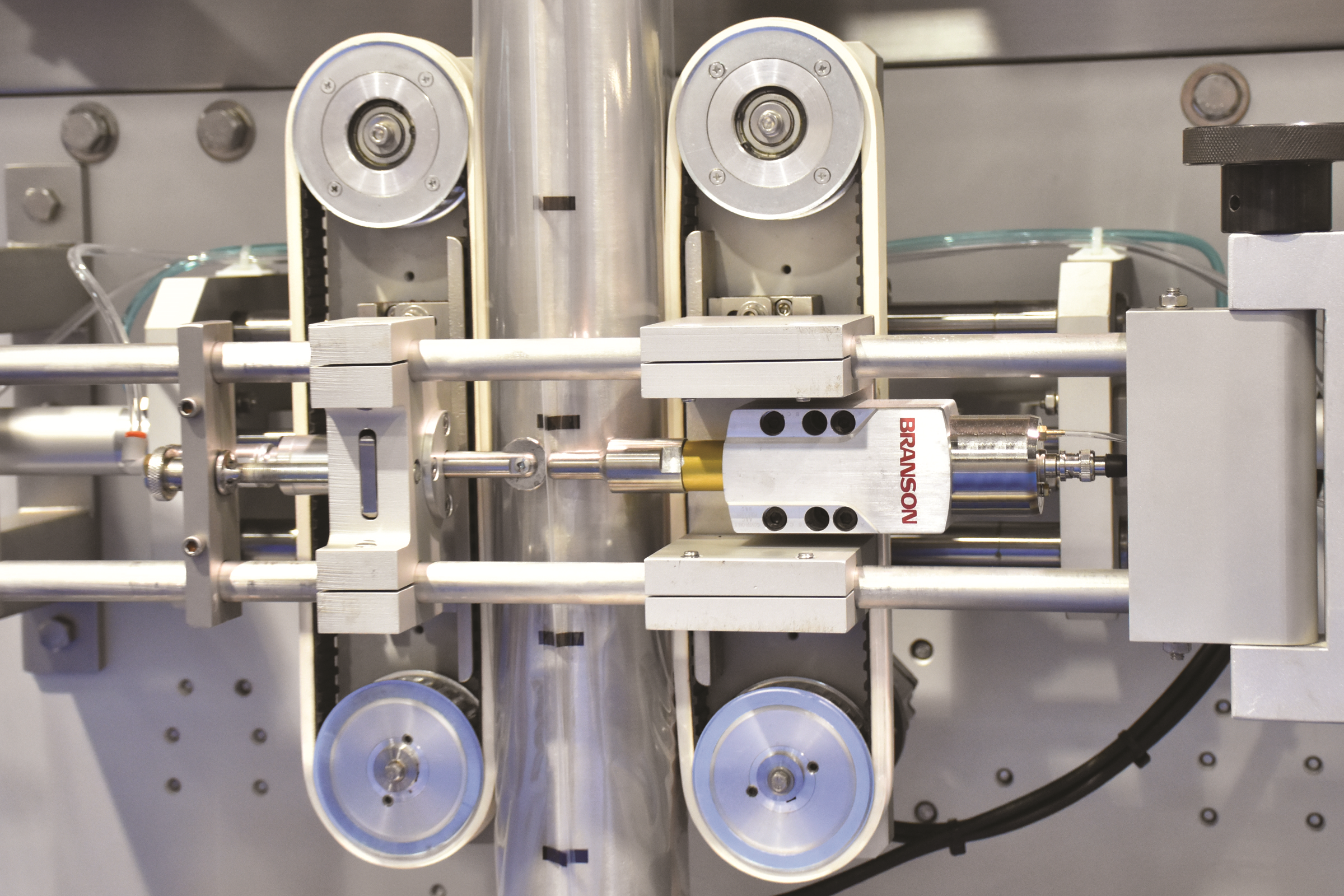 The Ultrasonic-sealing Vertical Form Fill System (VFFS) offers multiple advantages over heat-sealing systems. By applying ultrasonic energy, the VFFS effectively seals through all product containments, providing a consistent, reliable solution for a wide range of product packaging applications. It seals through contaminants, eliminates waste and enhances performance and throughput. Ask your machine builders to integrate Branson ultrasonic welding into their VFF systems.