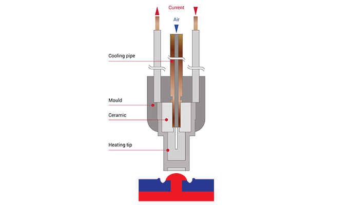 When an electrical current flows through the heating tip, the electrical resistance creates heating effect. The heat staking tip is brought into contact with the thermoplastic part to be reformed.The heating tip is then heated by direct electrical heating within the tip for a short period of time. The heated tip softens the plastic material and forms the melted plastic into the shape of the tip.